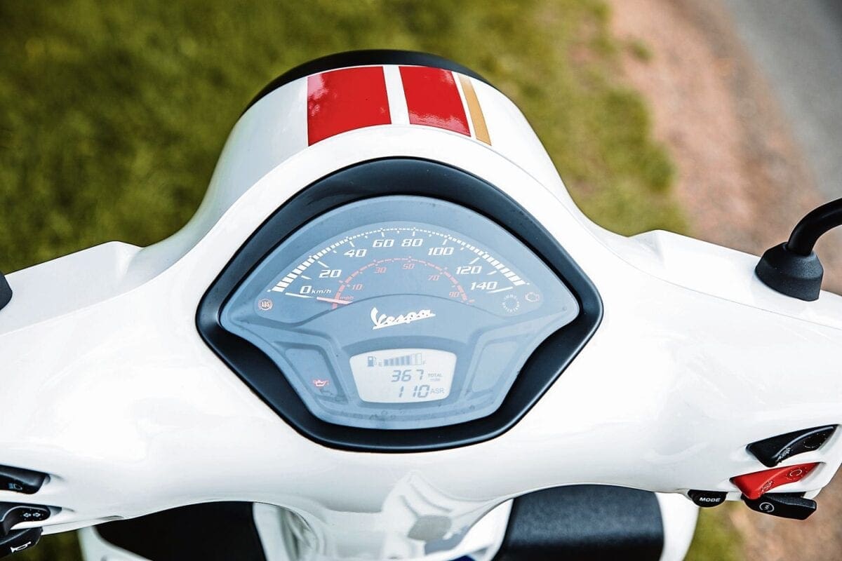 How about handling? Well, suspension comes in the form of a fork with coil spring and hydraulic control at the front and twin hydraulic shocks with preload adjustment at the rear. And it performs remarkably well, offering top notch ride quality. It’s still a scooter, not an adventure bike, so barrel over some particularly rough roads and you’ll definitely feel it – but at least you don’t need to worry about unsettling the scooter. I tried and tried to make that happen, rattling over pot holes, access covers, drain covers, gravel, spilled diesel and plenty of waterlogged Tarmac with no problems. It ate the lot up without a second thought. The only time I came close was when I took a bit too much speed into a corner on a very, very wet day. I had to grab a gentle handful of brake to slow myself down in time to bank over and get around, but I felt the back end twitching beneath me. That was it though, no problems – just everything working quietly away underneath the surface to keep me safe and upright. The ABS that comes fitted as standard probably had a part to play in keeping me vertical. It works on both the front and rear – and while the rear was a little easier to engage when provoked with a big handful of back brake, there’s plenty of feedback and very little unnatural intrusion. Speaking of stopping – braking is looked after by a set of single 220mm discs at both the front and rear, which are gripped by a set of Piaggio’s own calipers. Maybe you’d expected some big name one’s on a scooter of this calibre, but in reality, you don’t need them. The Vespa will stop you with no trouble and there’s plenty of bite when you really need it, without being snatchy and unsettling. And for nipping through small spots in town traffic and turns in the road, they are progressive enough to feather the back and decrease your radius to next to nothing.