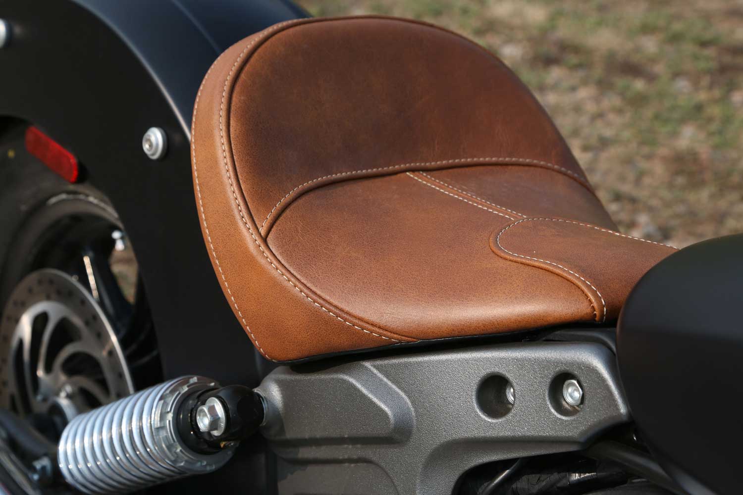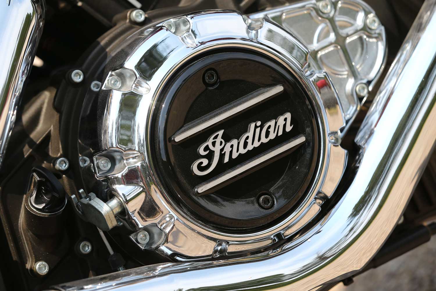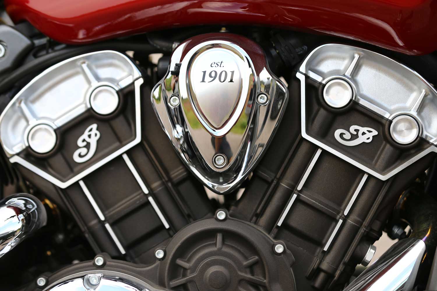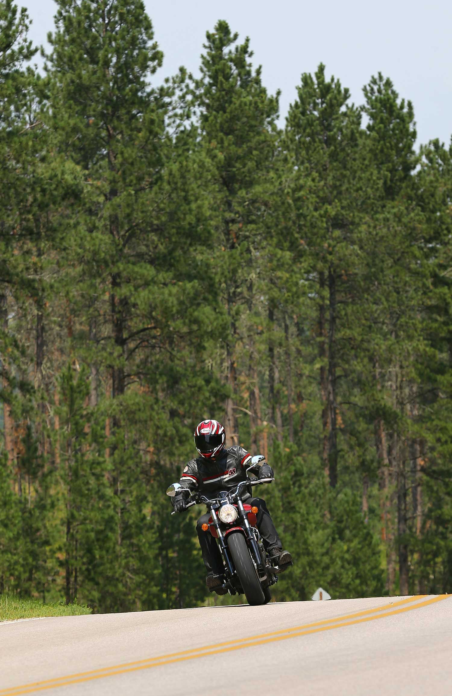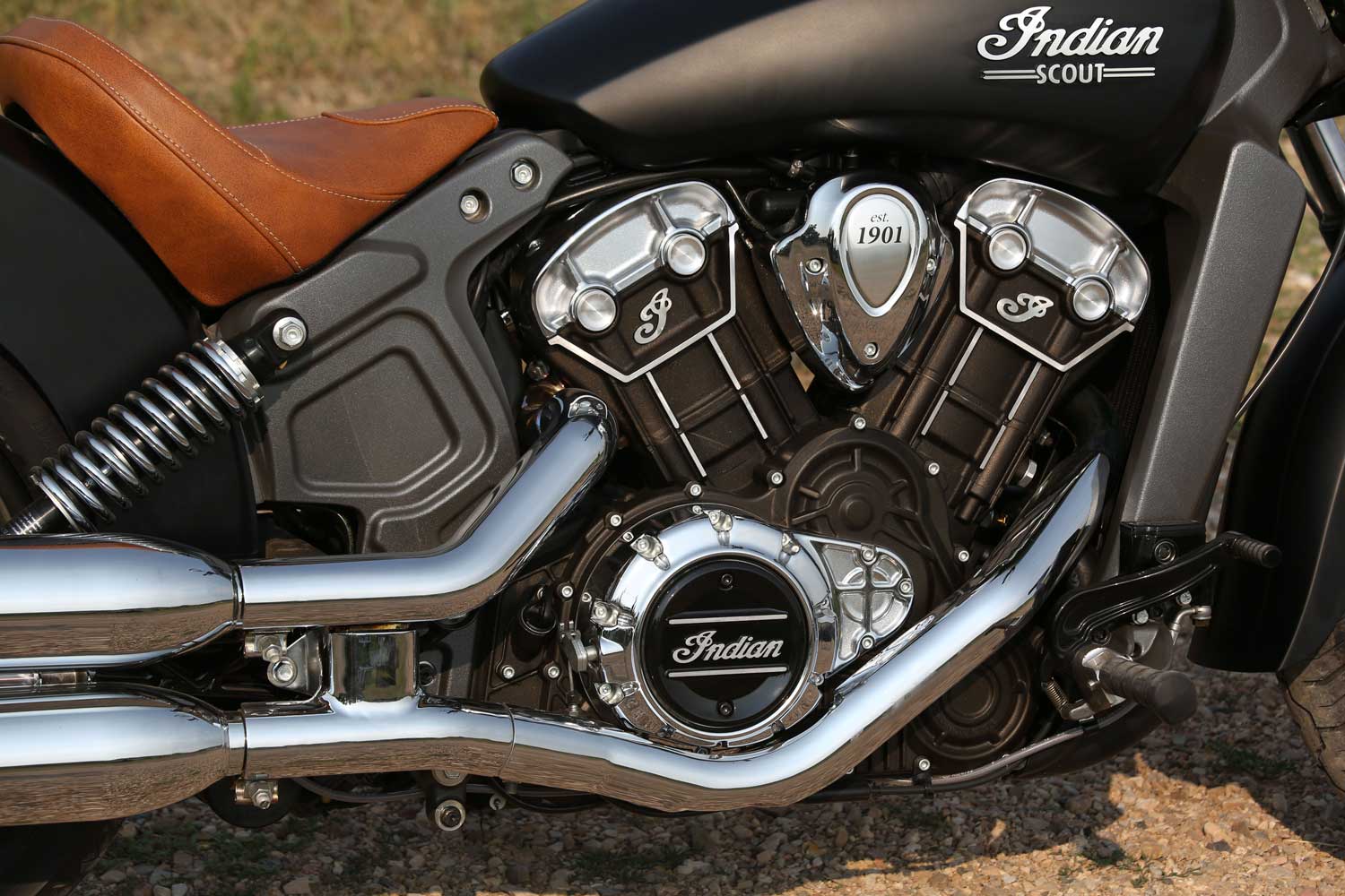 It’s a far cry from the Chief’s old-school air-cooled, pushrod-operated V-twin, which set its cylinders at a 49-degree angle because that was the closest that Indian’s engineers could get to the traditional 42 degrees. The liquid-cooled Scout has a wider, 60-degree cylinder angle, eight valves and DOHC operation, allowing better breathing for an injection system that is controlled by ride-by-wire throttle. There’s no attempt to add unnecessary cooling fins; instead the Scout’s engine cases are sculpted to show the shape of the components within.
