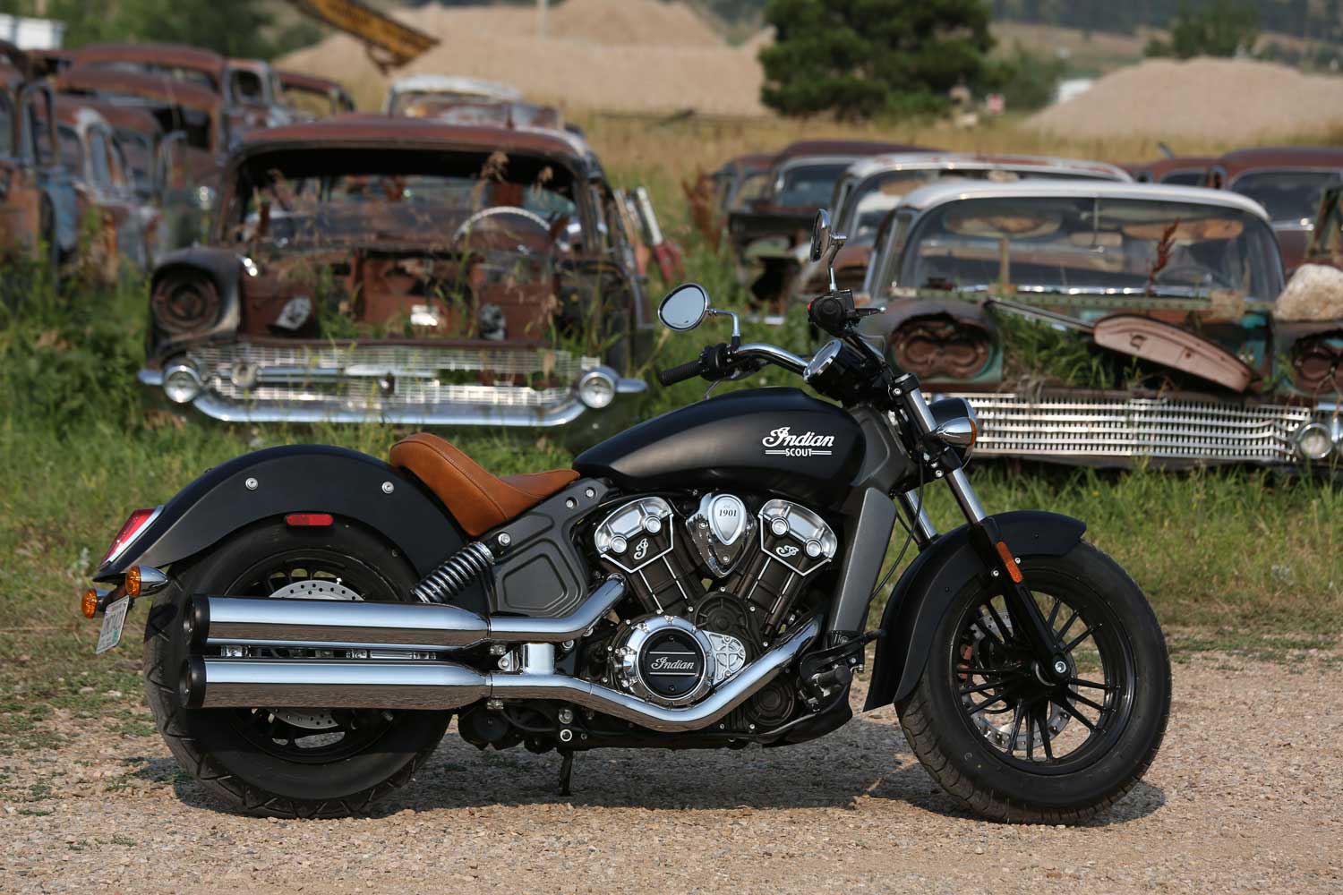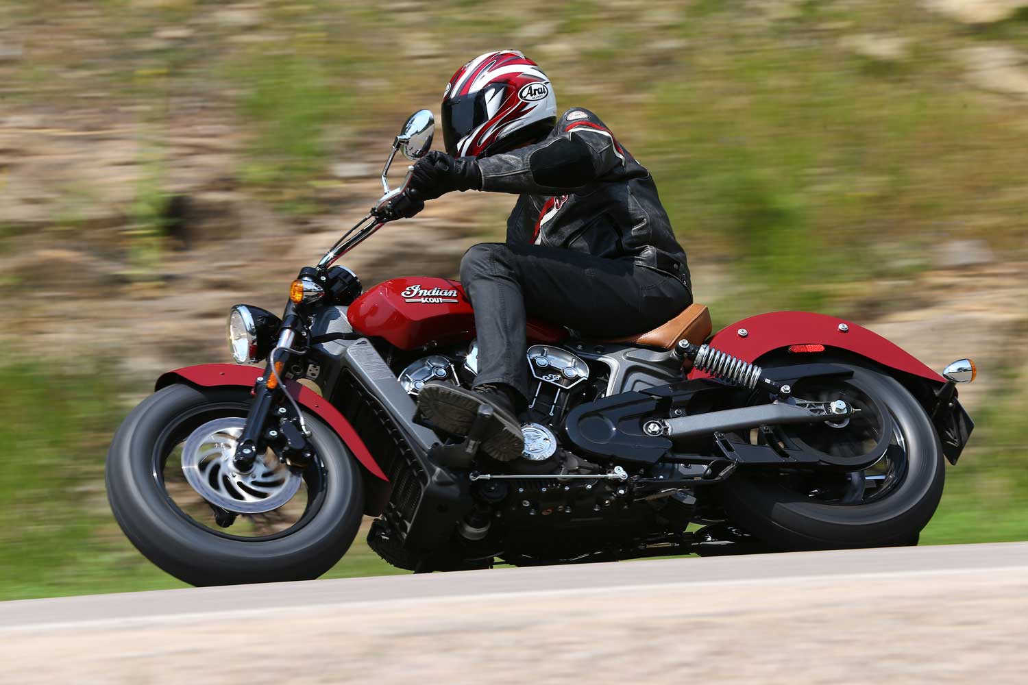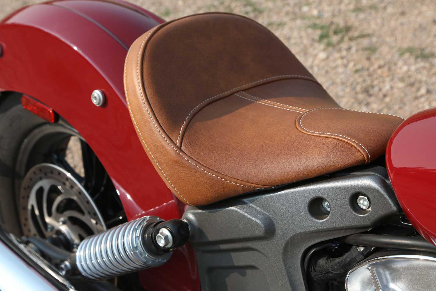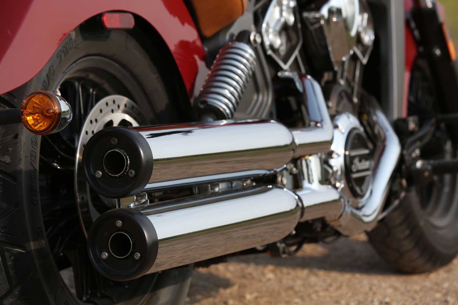 It’s a far cry from the Chief’s old-school air-cooled, pushrod-operated V-twin, which set its cylinders at a 49-degree angle because that was the closest that Indian’s engineers could get to the traditional 42 degrees. The liquid-cooled Scout has a wider, 60-degree cylinder angle, eight valves and DOHC operation, allowing better breathing for an injection system that is controlled by ride-by-wire throttle. There’s no attempt to add unnecessary cooling fins; instead the Scout’s engine cases are sculpted to show the shape of the components within.