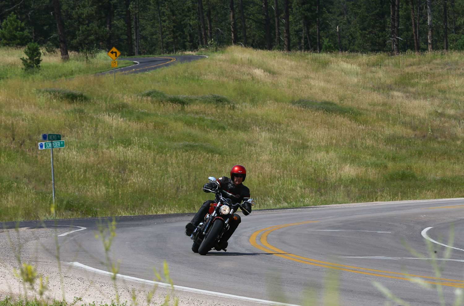 That makes it great fun and respectably quick if you’re in the mood, as its stretches your arms all the way to an indicated 120mph with more to come. The one-piece handlebar is wide and not particularly raised, but that seems fast enough given the fairly forward-set footrests and low seat, which makes for a distinctly cruiser-like riding position.