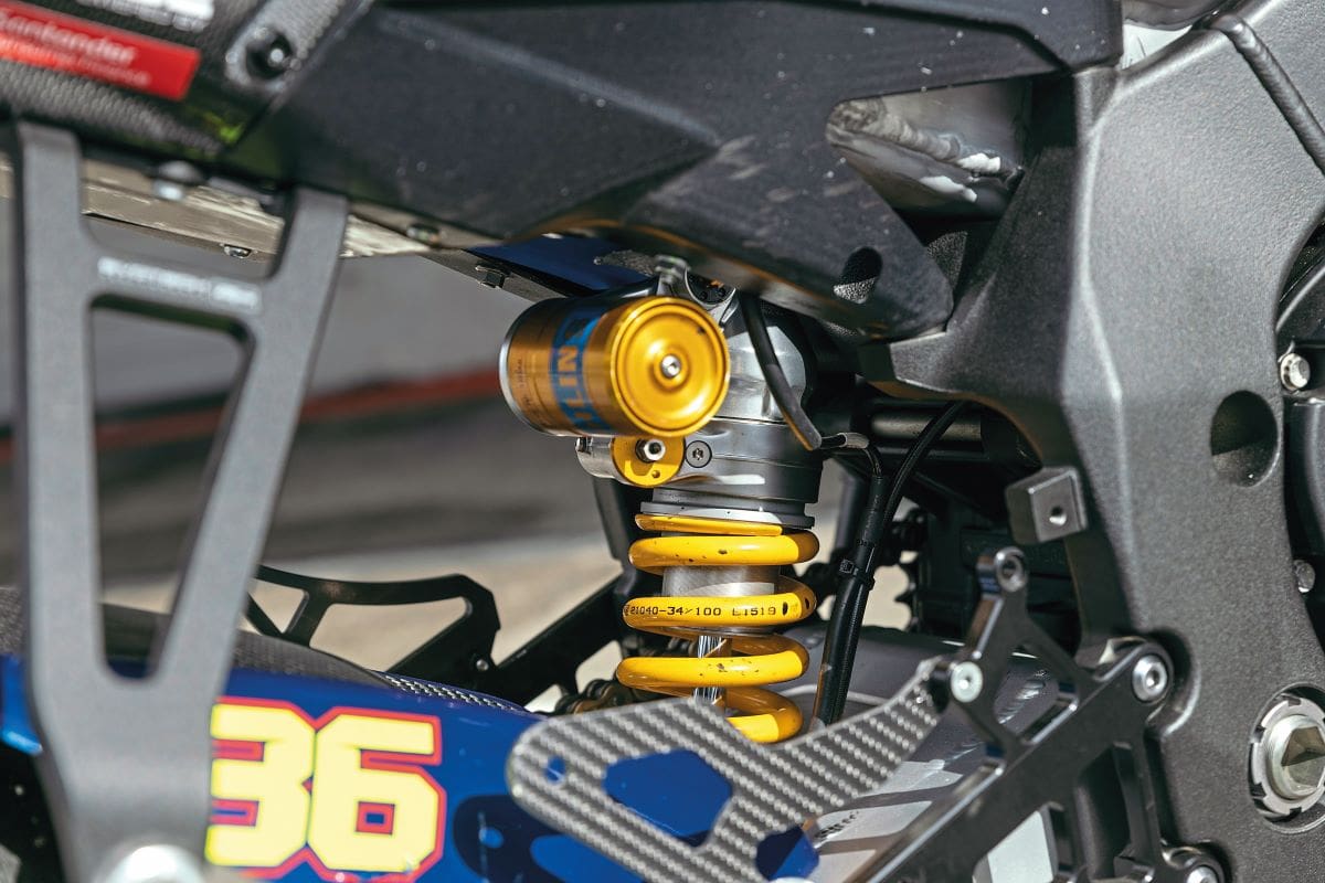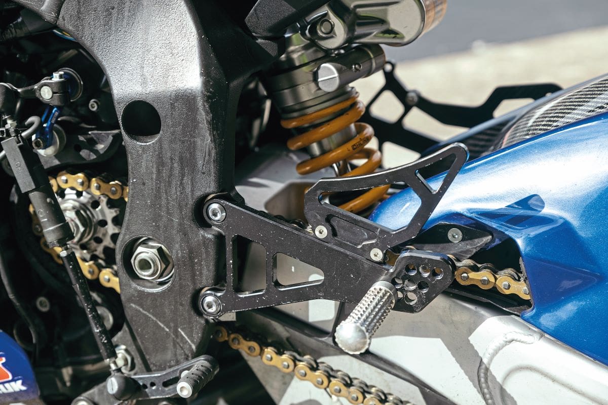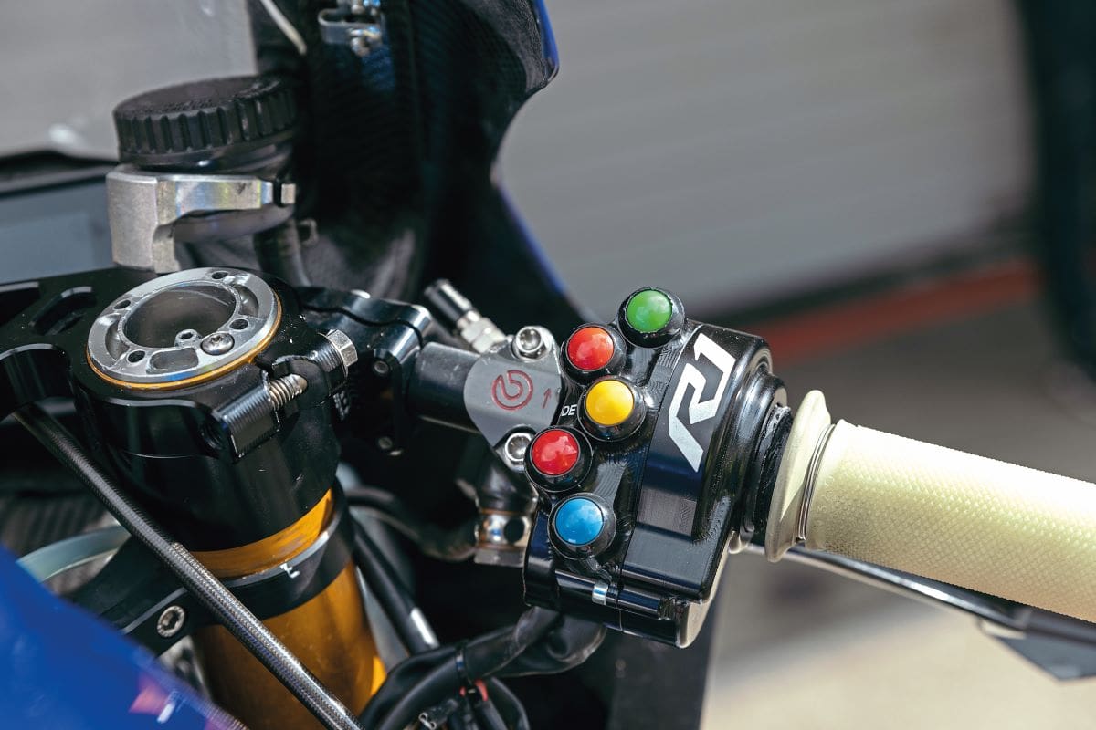 Looking at the bike, I presumed Glyn would have been running the Motec electronics system, but since BSB rulings state you can’t use rider aids such as anti-wheelie or traction control, Glyn opted for the Kit YEC loom and ECU as it’s a far easier system to bolt on and go use while retaining the rider aids. He has found the anti-wheelie system to be a little peaky, which is another reason why he opted for the scooter-style rear brake – just to try and keep things settled during hard acceleration. Glyn is running the standard dash at the moment, and he hasn’t added any data collection to the bike as it does everything he requires. He hasn’t bothered using an aftermarket quickshifter either, as the standard one does the job and it’s what the BSB team uses on its superbikes, believe it or not. It works with the kit loom nicely and is fully adjustable with the software.