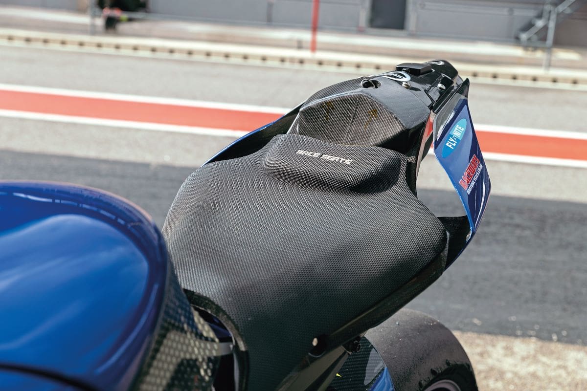Glyn’s running the 2019 carbon fibre body work because Raceways had some fairing kits left over from the season and they work perfectly with the upsized SBK tank and cowlings.