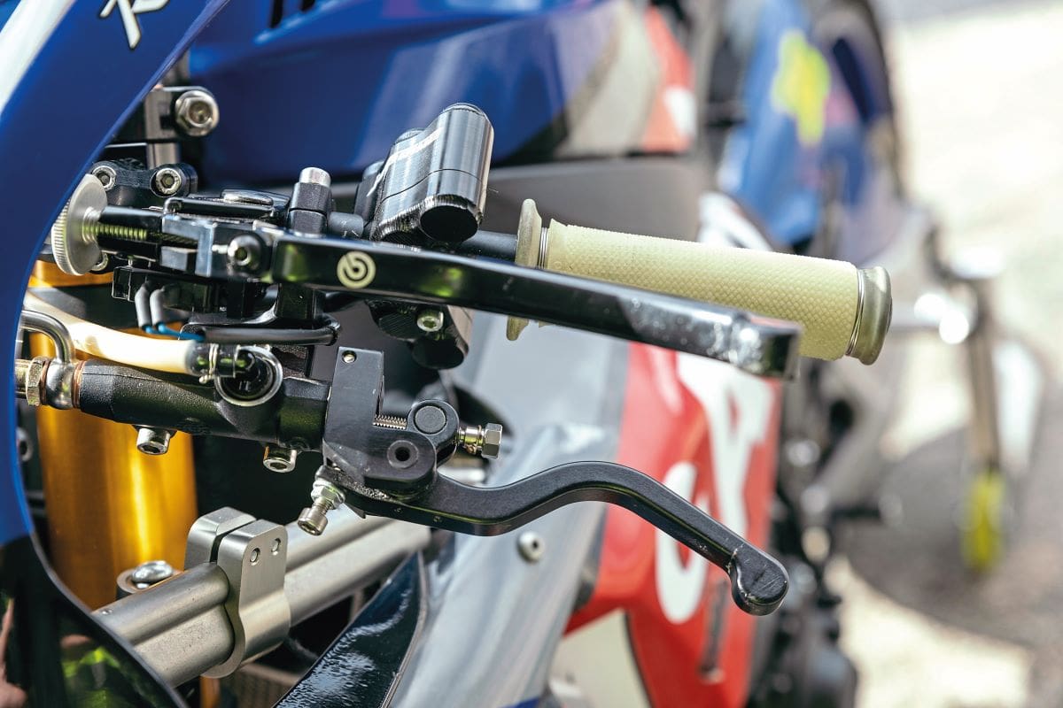 Having known the lads at Raceways for years, Glyn got first dibs on the some of the spare and ex-race kit – as you can imagine, he was like a kid in a sweet shop. A set of factory Öhlins RVP 25 forks (which are £12,000 new!) were a must, and a Suter swingarm, which has been developed and used in WSBK and BSB, was the next biggy to tick off the list. It’s stiffer and lighter than the standard swingarm, so provides better grip, handling, and more feel – you’d be stupid to let that one slip through the net. To get the chassis rolling, a pair of lightweight OZ Pista magnesium wheels with Dunlop KR range tyres have been fitted, and to get Glyn pulled up into the corners, he’s looked no further than the very best – a full Brembo set-up, Corsa Corta master cylinder, Brembo GP4 RX calipers with Z04 pads… oh, and not forgetting the scooter-style rear brake lever that was designed by the factory Yamaha WSBK team. Factory triple clamps allowing for offset adjustment ties the front end together, and IMA clip-ons that push the bars out an extra 20mm further help the big man get tucked in down the straights… every little helps!