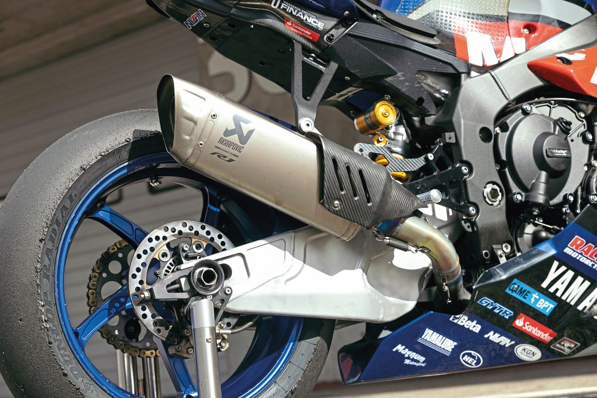 The big question is – is it really a superbike if it’s got a standard engine? Of course not. Kev Stephenson, Raceway’s engine builder, has worked his magic on the cylinder head and used factory cams to give the motor that little bit more umph. He’s kept the bottom end standard to keep the costs down and maintain some reliability, and the kit airbox with velocity stacks and the titanium Akrapovic exhaust system keeps everything breathing properly.