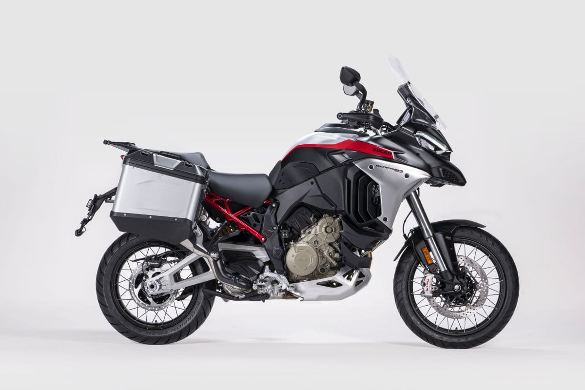 The new Ducati Multistrada V4 Rally is offered in three different versions: Adventure Radar, equipped with Adaptive Cruise Control and Blind Spot Detection, Adventure Travel & Radar, which adds aluminium side cases, heated grips and saddles, while the Full Adventure completes this latter equipment with a homologated Akrapovič silencer and a carbon fibre front mudguard.