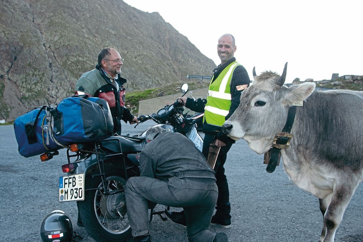 After a few days of local exploration, we set off for Sud Tyrol in northern Italy. Now we were five, having been joined by Hannes and experienced worldwide rider Brian Gohery. Leaving the plains around Munich, we soon passed through the narrow stretch of western Austria and took the toll road from Mautstelle that wound its way to the 2509-metre Timmeljoch Pass that forms the border between Austria and Italy. Near the summit a cow wandered over to inspect while Hannes was replacing his snapped clutch cable. A nice touch, but we were fearful that it would knock over one of the bikes. They’re difficult beasts to move. (Cows or bikes? Ed.)