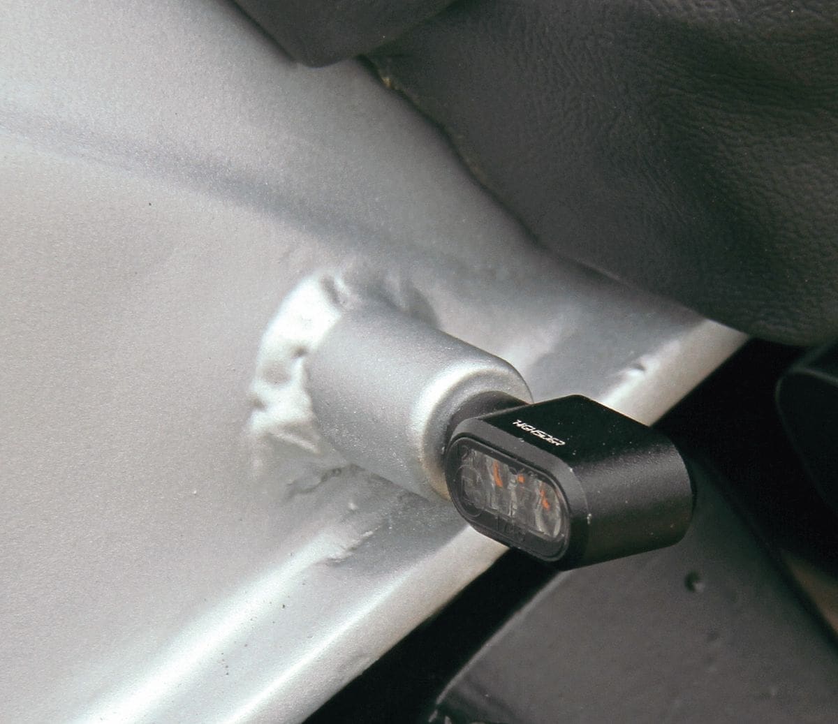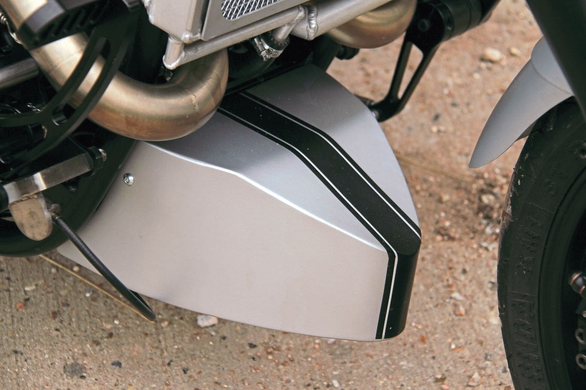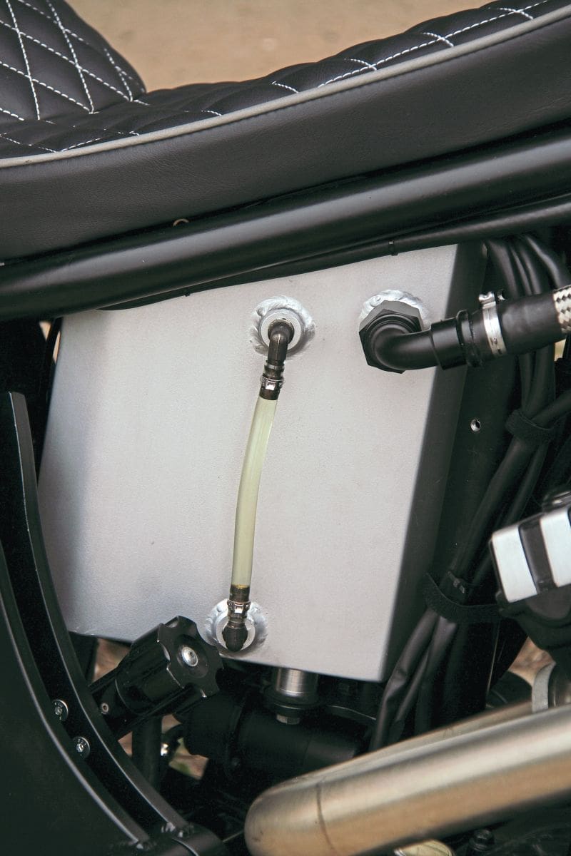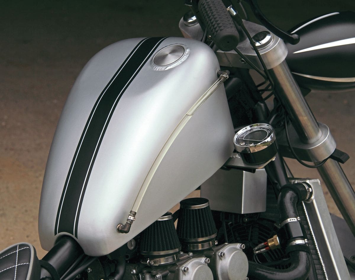 Those striking exhausts were done up in Nottingham before the bike began its journey downwards and leftwards (again, from Si’s) by Wayne at JAC Exhausts, who specialise in stainless exhausts and manifolds, and have been left raw, rather than polished until they shine like a cokehead’s bestest mirror, as that was the look wanted. Similarly, the oversize radiator, made by Darren at Custom Made Rads, was just painted silver, and the bodywork paint, all done in house at Kustom Choppers, was painted an equally understated silver with a simple black stripe (well, three of them actually).