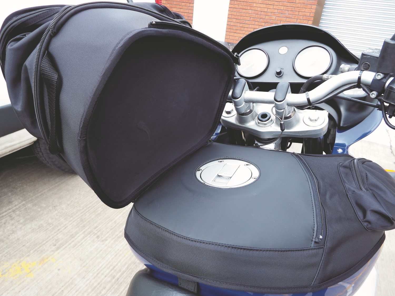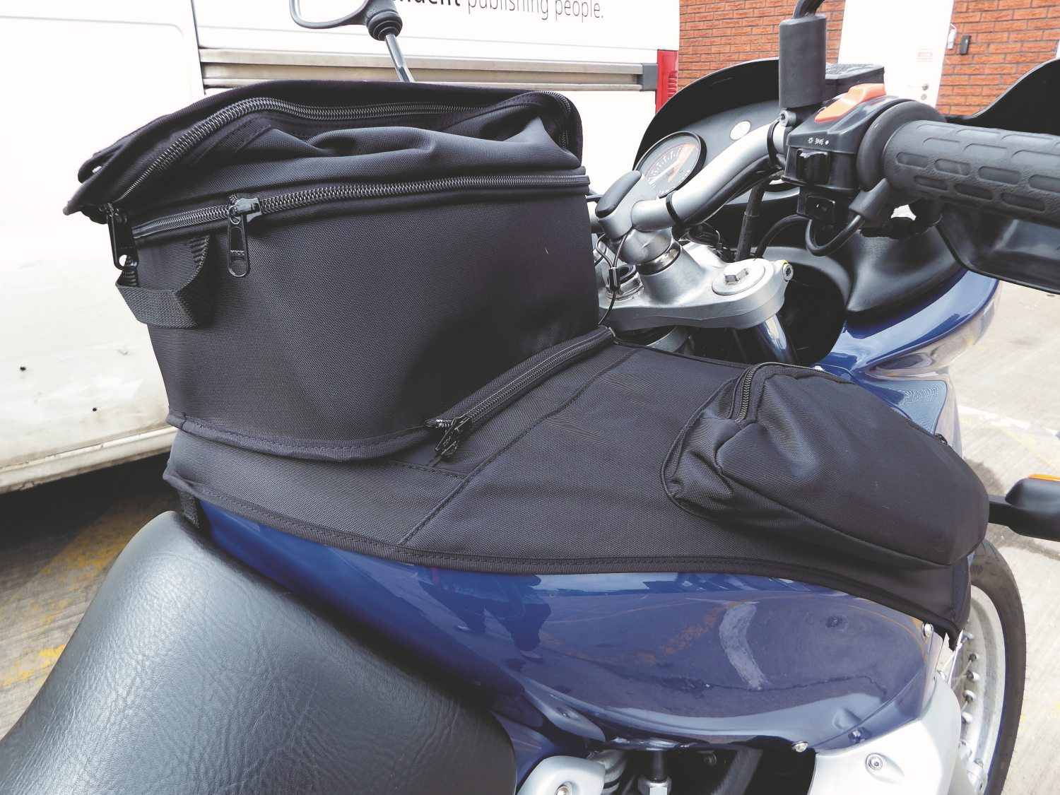 I’d tried and tried to find a tank bag to fit my 1997 BMW F650ST – with a plastic tank, the magnetic versions would be no good, and due to the layout of the filler cap, the nifty tank-lock systems wouldn’t fit either. Fortunately, BMW’s retrofit tank bag works a treat. Simply remove the seat, fit the fastening hook at the rear of the tank and then clip the two side straps round at the front of the fairing. With a maximum capacity of 15.5 litres when you unzip the expander, there’s plenty of room for waterproofs and packed lunches. When it comes to refuelling, just unzip one of the sides and lift the bag up.