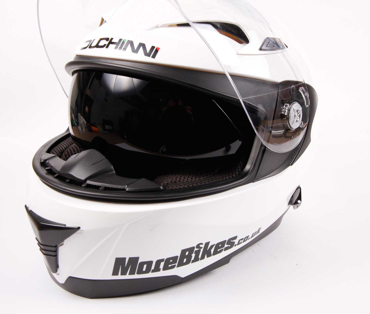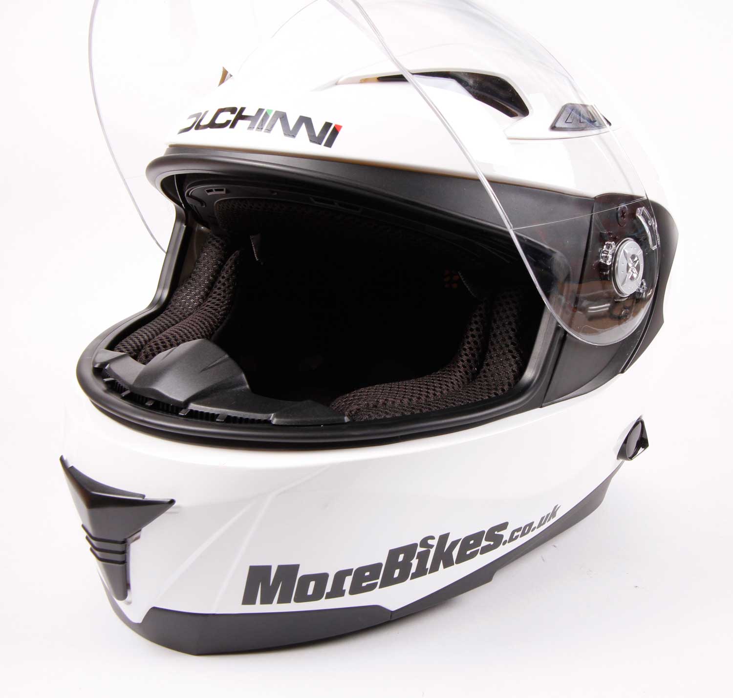 The Duchinni D405 is an EC22.05 approved helmet with ABS shell, quick-release seat-belt style chin-strap, integrated flip-down sun visor, and a removable, washable lining. A vent on the chin and a pair on the top can be opened to control air flow, while there’s an exhaust vent at the rear. People often ask if a lid’s noisy, but I’ve yet to find a helmet that doesn’t require earplugs, and the D405 seems no louder than many other helmets I’ve tried.
