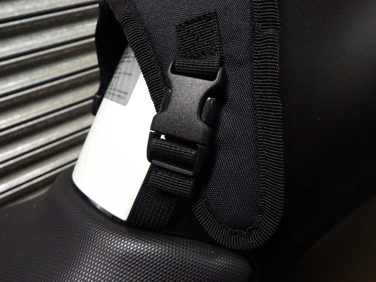 I’ve always used rucksacks as I thought that non-magnetic tank bags would require a whole load of fitment and hassle. Now I’m a tank bag convert and proud to admit it. Fitting was simple, and didn’t require any tools as the straps wrap around the frame and clip into place. After taking advice from the guys in the office, I took the seat off and also secured it from under the front of the seat, and now it’s not going anywhere…