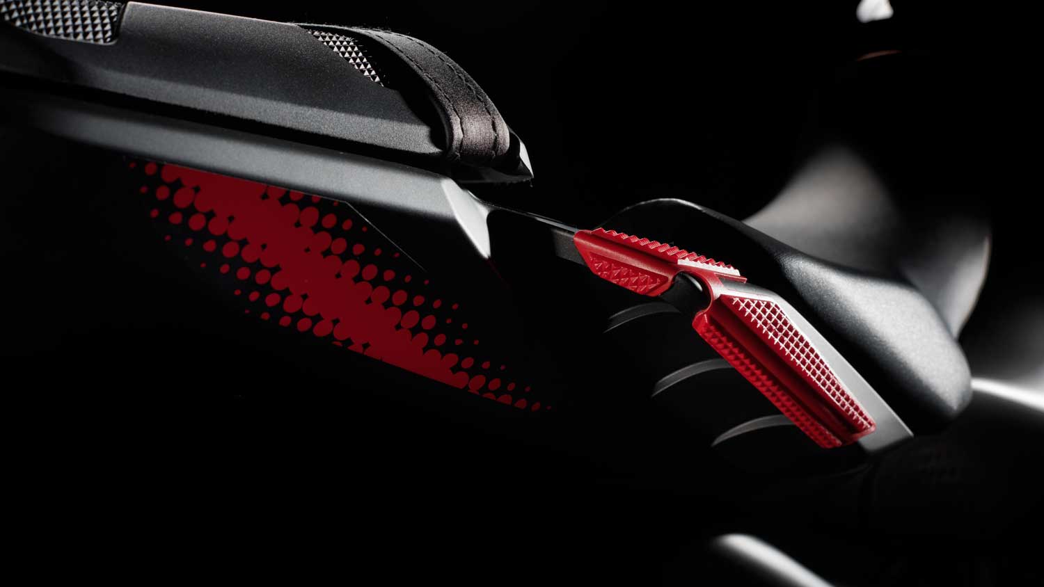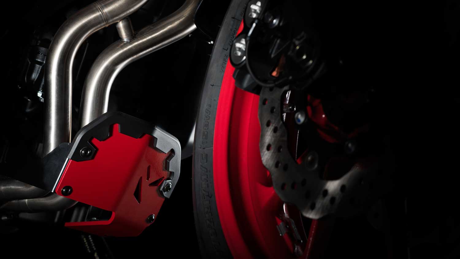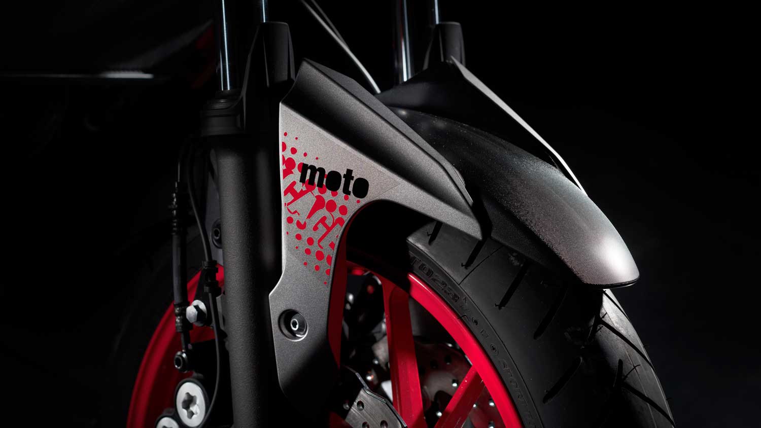 The Moto Cage comes in a Matt Grey base colour, and features exclusive new red graphics on the tank and tail unit – as well as a number of red chassis components – that highlight the bike’s street-inspired looks. To underline its unique appeal it is fitted with a red front wheel combined with a black rear wheel featuring a red pin stripe.