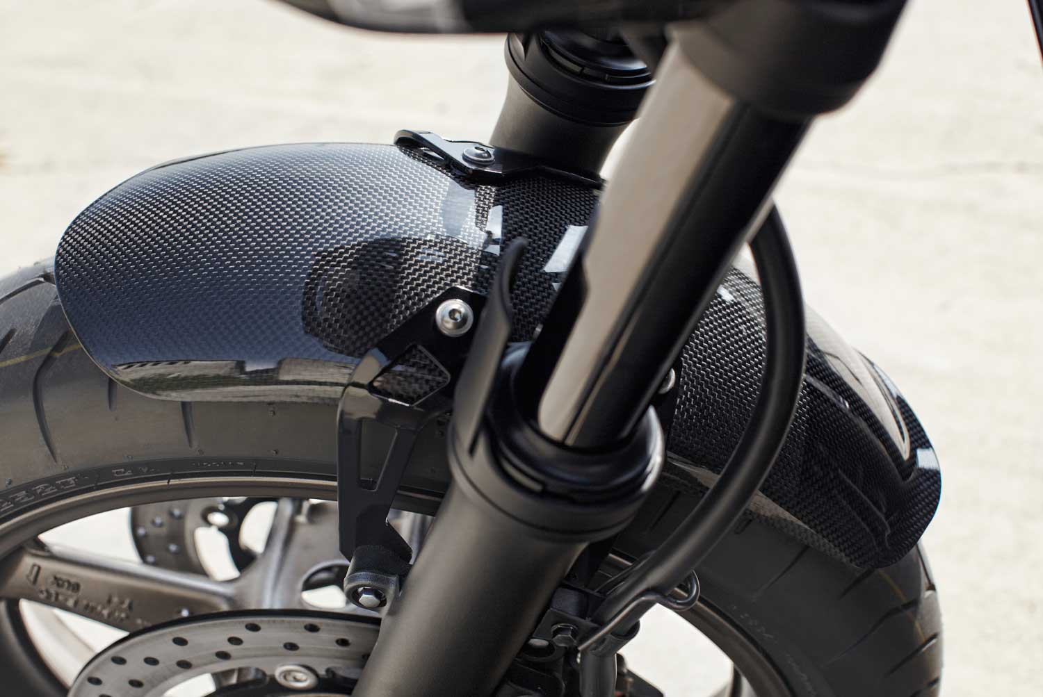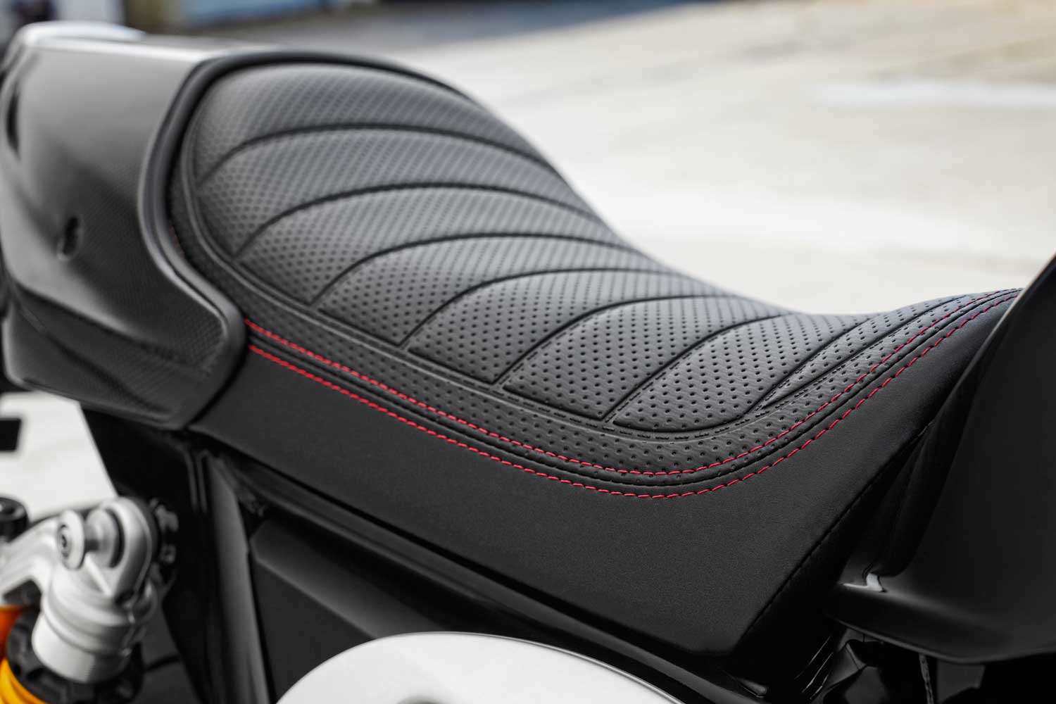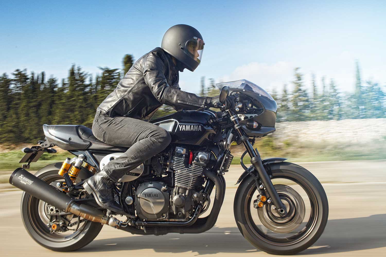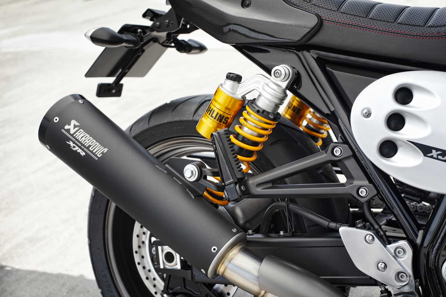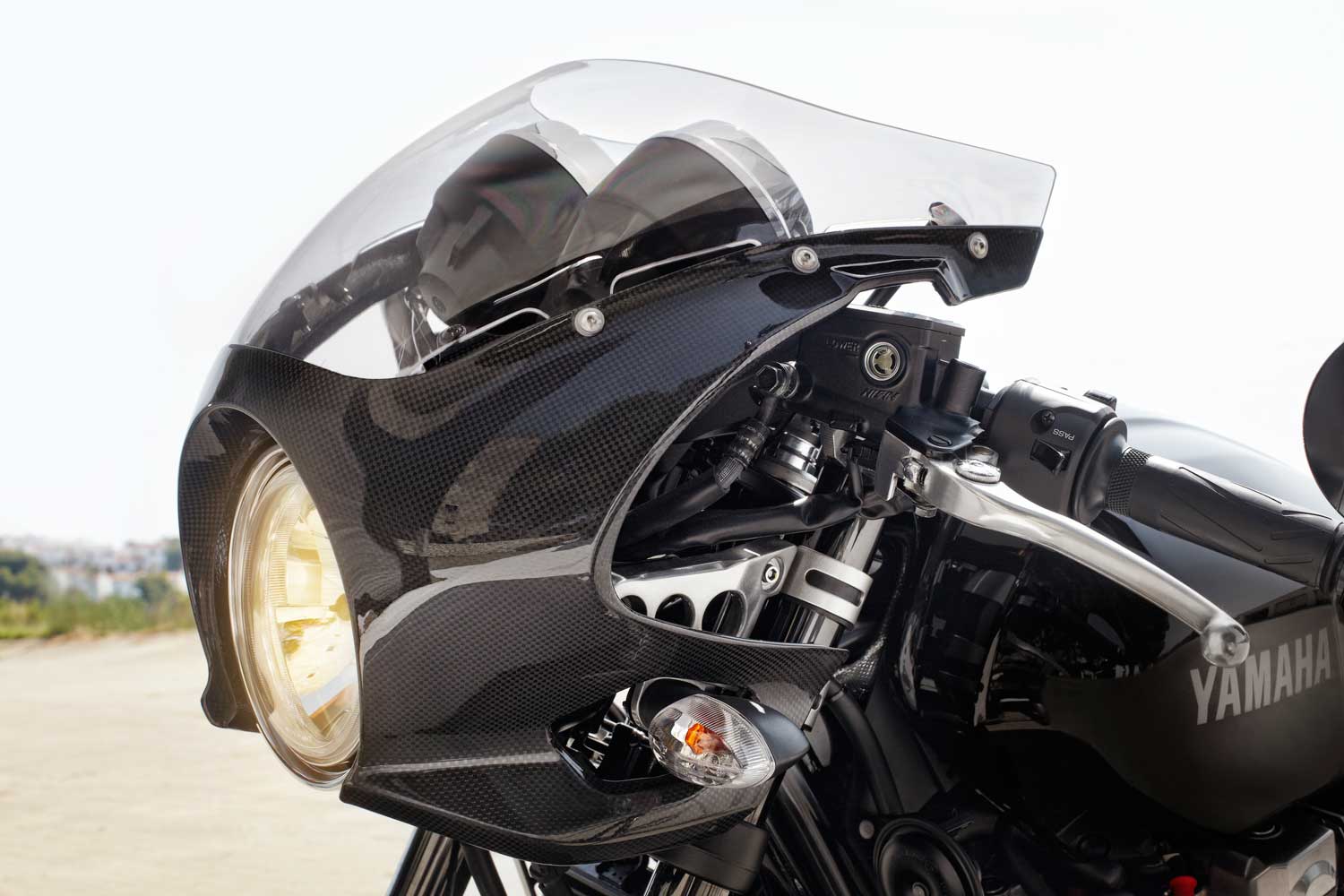A cool carbon cowling and short carbon front fender pay homage to the iconic café racers of the seventies whilst period style clip-on handlebars are used to deliver the correct riding position. The beautiful and sporty styled solo-seat design is further enhanced with a carbon seat cover to complete the look. The riding position is more focused than the standard XJR giving a genuine Café race style with a narrower, more forward sportier feel.
