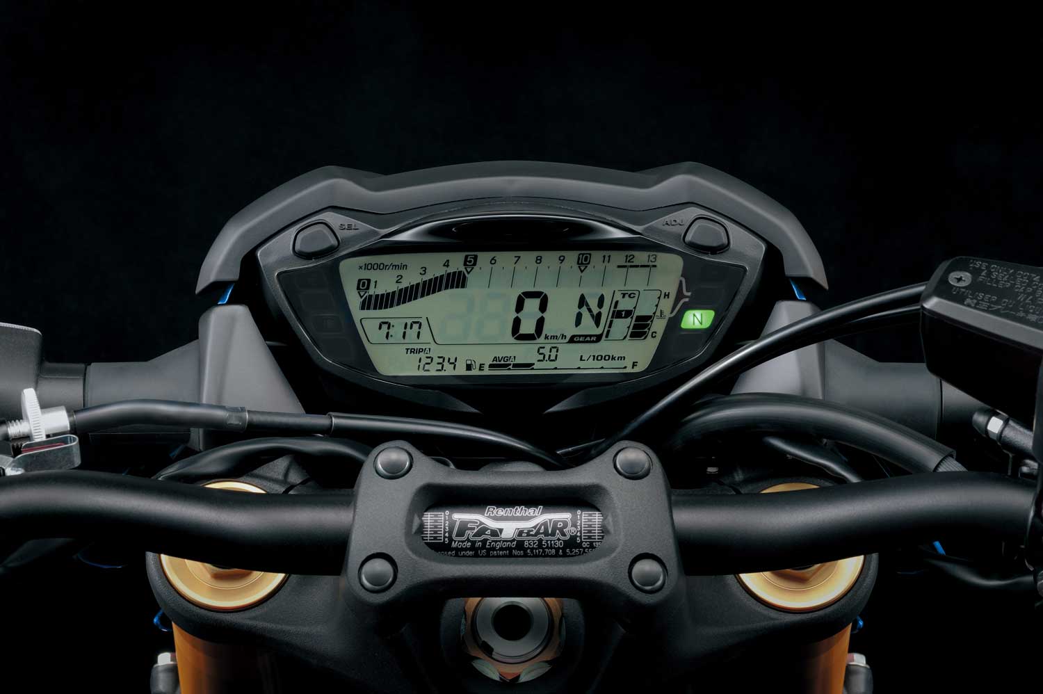 Full LCD Instrument cluster is designed lightweight and compact. Thanks to its full-LCD design, it eliminates motor and needle mechanics, it weighs only 275g. (i.e. GSR750 instrument: 320g, GSX-R1000 instrument: 380g)