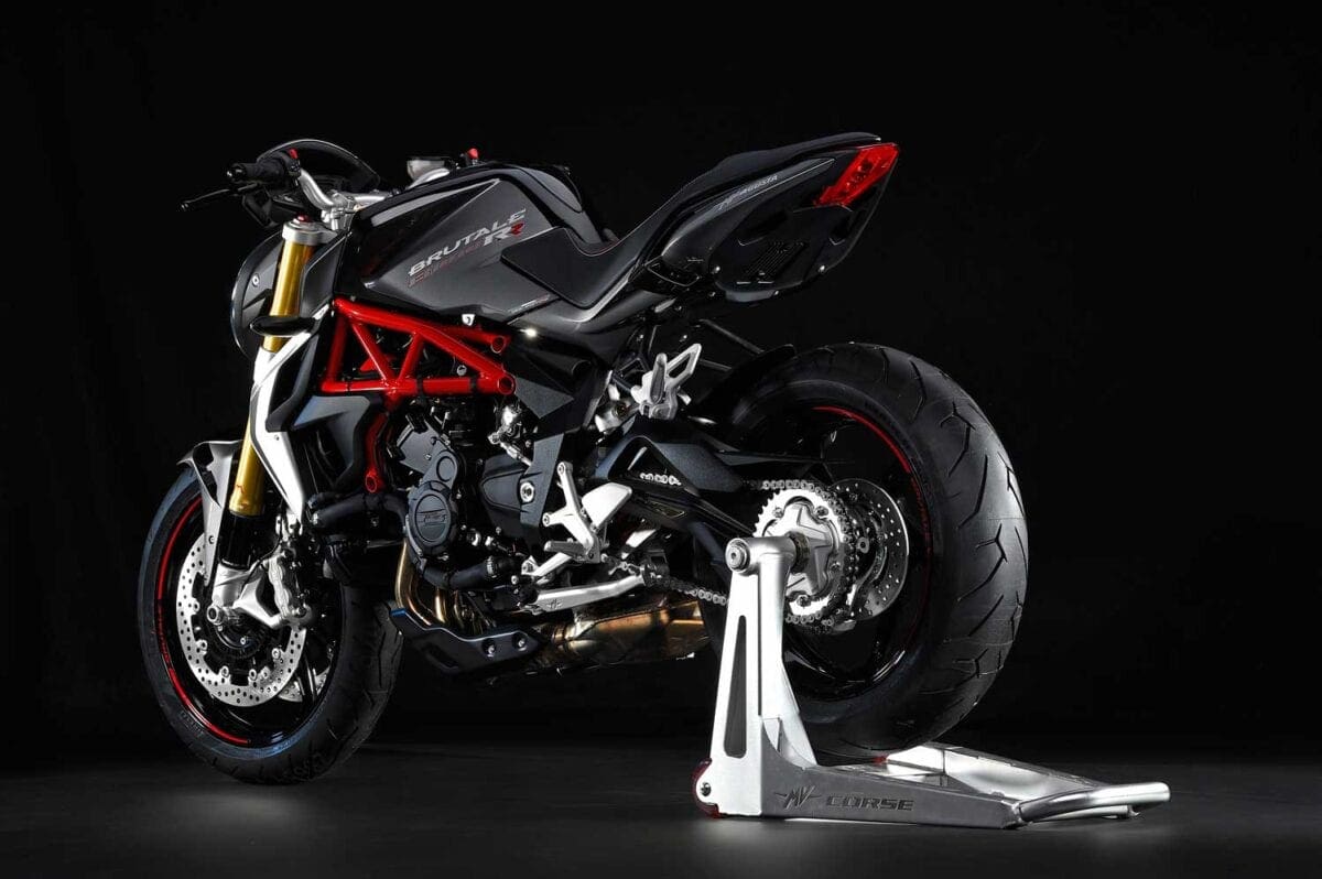 While a dry weight of 168kg and wheelbase of 1380mm matches the new Dragster RR, the Brutale RR is 25mm longer, at 2085mm. While the promotional pictures don’t show it, this is no doubt thanks to the large tail and numberplate plastics that’ll hang from the rear of the seat. The press-pack included a couple of pictures admitting to the regulatory attachment. Apparently, the Brutale RR is also 1mm lower at the seat (810mm), which we’re pretty sure could be a deal-breaker for shorter riders!
