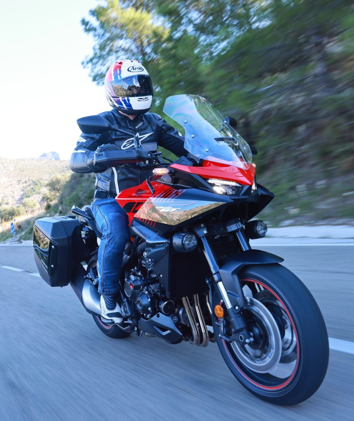 Its crossover 1000cc in-line four powerplant, which itself is derived from the 2017 Fireblade, sees no changes to the internals, though a few refinements have been made within the ECU to allow for a more user-friendly feed of power for the touring option. Acceleration from the lower rev-range is now smoother over the Hornet’s engine and this feel is also noticeable when accelerating hard through the gears. On paper, this slight rework in the electronics has only made a minor difference in power figures, dropping just 7 horses from the Hornet’s total to still provide a healthy 148bhp, with torque also marginally down, but still sitting at 102Nm @ 8,750rpm. The work carried out here proved to make riding through towns that much easier without sacrificing the rev-happy nature of the engine and this should also make riding with a pillion that much smoother too. As you’d expect, another change to the bike’s formula is a beefier rear subframe to enable potential added weight of a pillion and panniers brimmed with pants. Another key addition is electronically adjustable suspension, which caught me by surprise having not expected it on bike hitting the market at just £11,999.