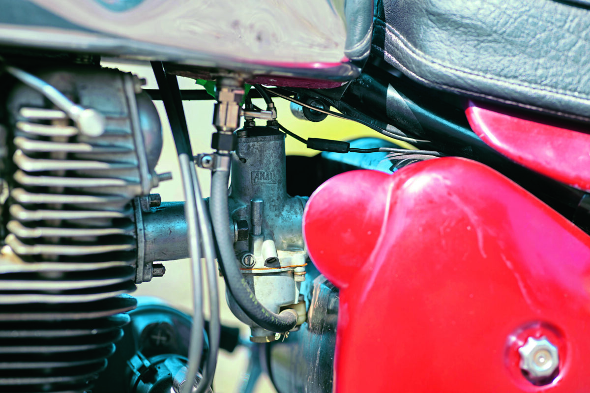 That the feature machine before us was registered in September 1963, makes it one of the last of the Constellations produced, for the model was to be dropped from the range for 1964. Consulting Roy Bacon’s book British Motorcycle of the 1960s also brings up an interesting point; the only Constellation listed for 1963 was (to quote the aforementioned book) ‘…available only as a sidecar machine, and to this end was detuned to the Meteor specification, with low compression ratio, one carburettor and coil ignition. A siamesed exhaust system was fitted as standard, twin systems being an option. To suit sidecar use, the machine had lowered gearing, reduced fork trial, stiff suspension and a steering damper.’