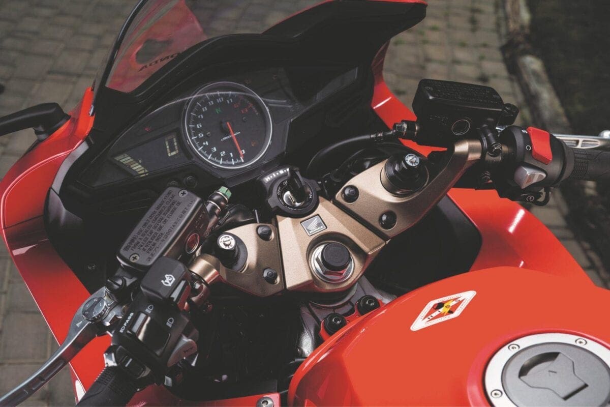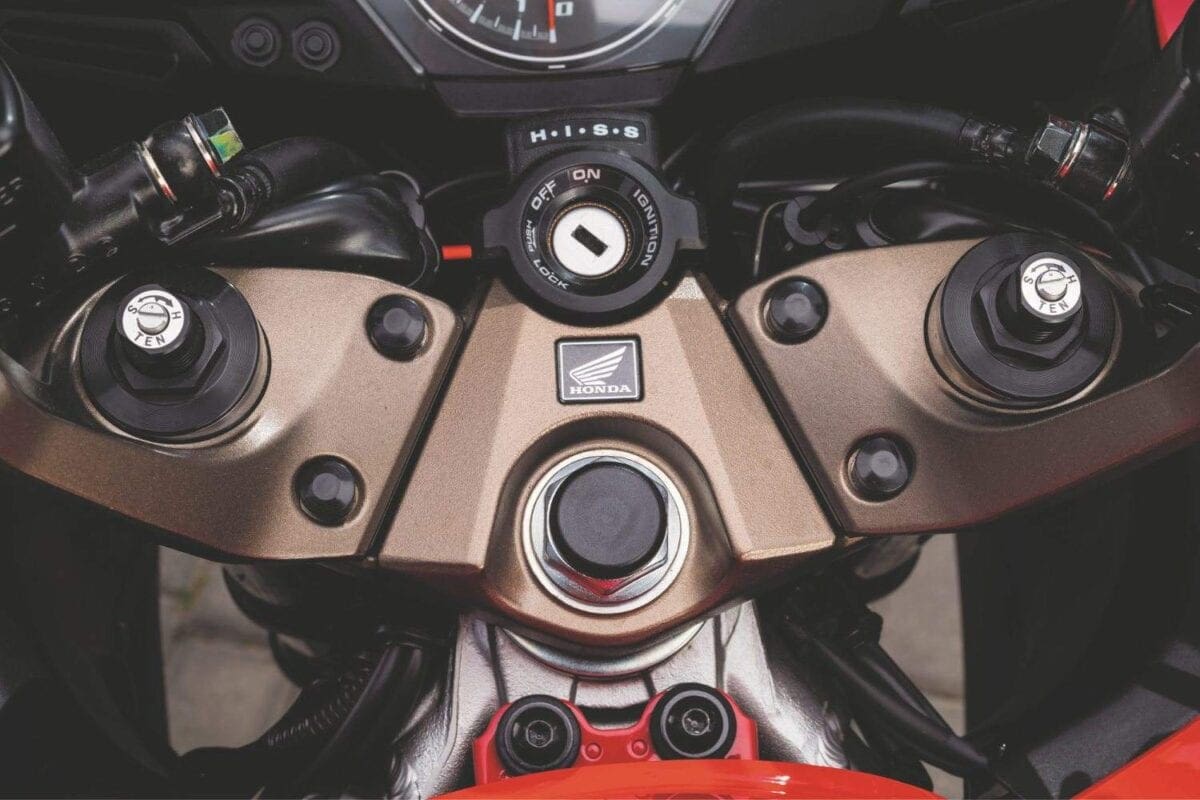 Below 7000rpm, the emitted engine noise is more whiney, with the air induction being more prominent than the exhaust note. As you crest the magic threshold, the VTEC becomes king, with an additional deep, mechanical noise joining the mix. It’s totally unmistakable to the ear, albeit you could be forgiven for not noticing it physically, because the process is now super smooth. Once in VTEC parameters, the bike’s acceleration remains linear, and hasty all the way up to the 12,500rpm limiter.