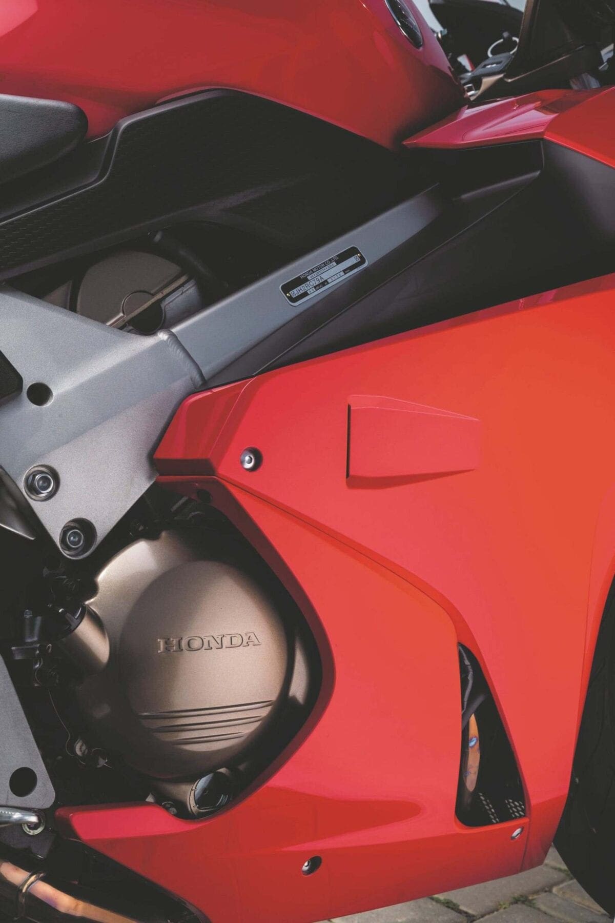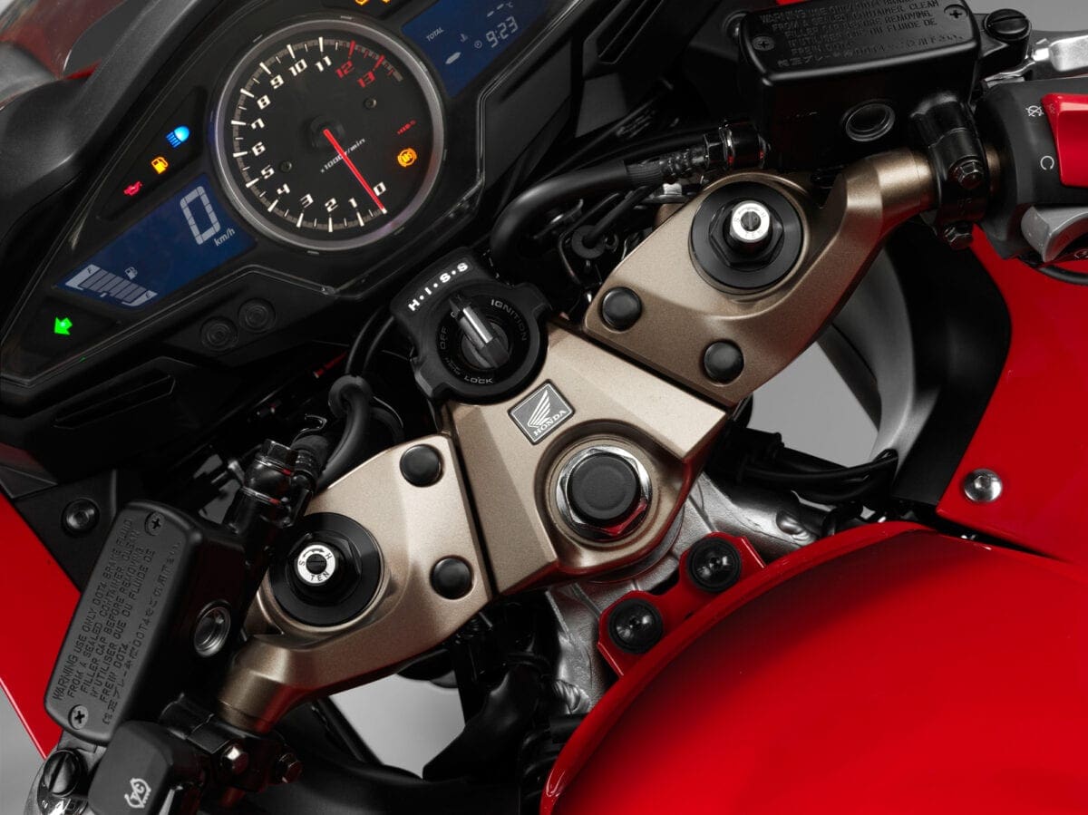 But it’s not just about the quantity of tech your getting; it’s the way in which it’s delivered. The finish on the VFR is fantastic. It will put most bikes’ build quality to shame, because so much attention to detail has been paid to the way it looks. The new styling is easy on the eye, but it’s when you get a bit closer that you realise the nice little touches which make this bike stand out. Take the VIN-plate, for example. It’s situated on the right side of the frame and it’s tacked on by two gold-headed pins. Continuing with that gold theme, the wheels are also