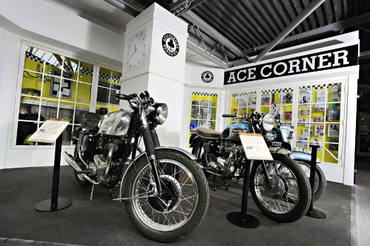 The Motorcycle Story takes the visitor on a journey through motorcycling history and the human quest for freedom, individuality and the desire to win. For the first time, machines are displayed in their historical and cultural context; tying technological developments to changing trends in fashion, style and sport. Supporting artefacts include clothing worn and trophies won by sporting greats in displays which cover varied racing disciplines as well as road safety, British ‘Mods and Rockers’ youth culture of the 1950s and 60s and the Ace Café scene.