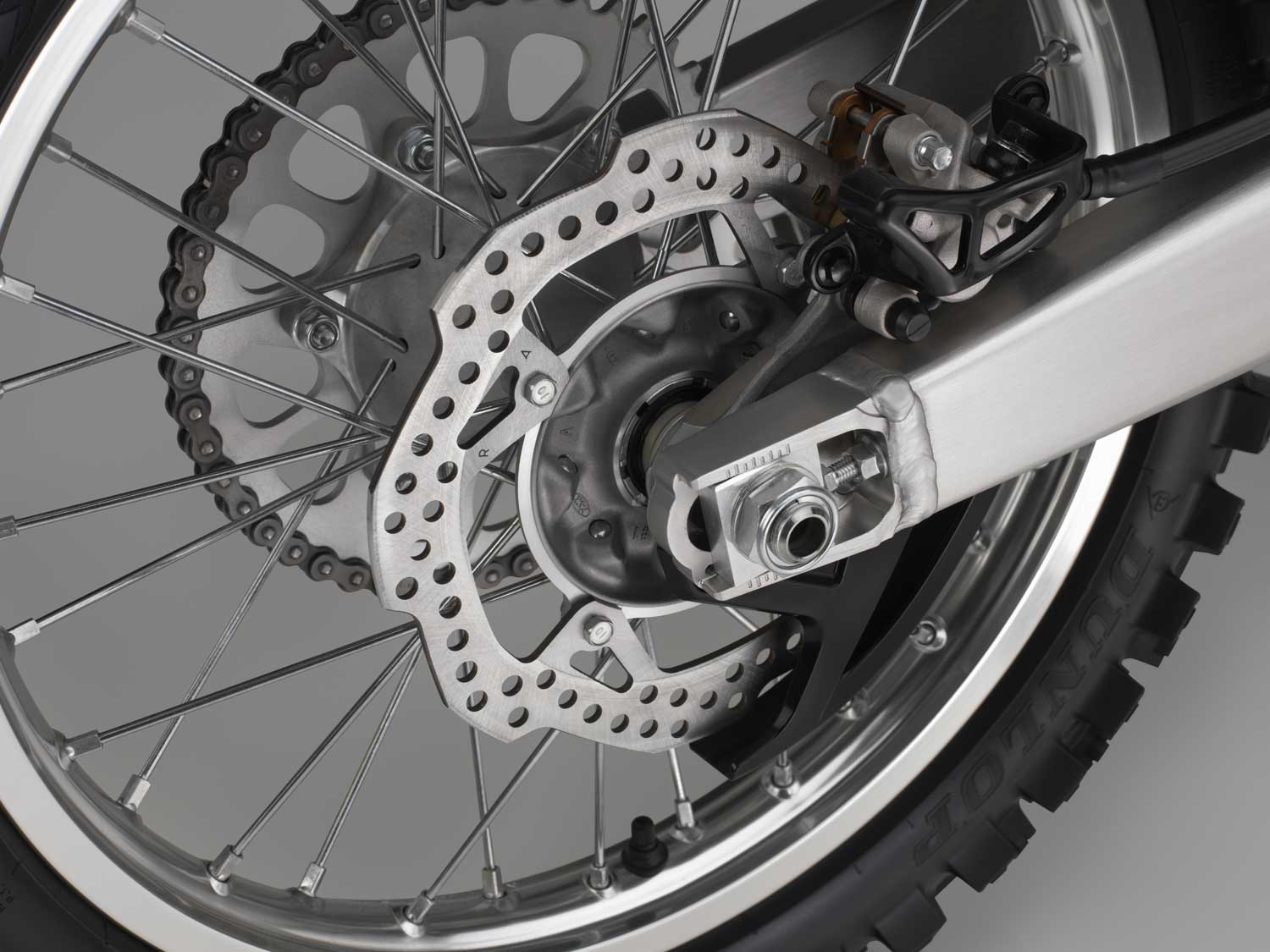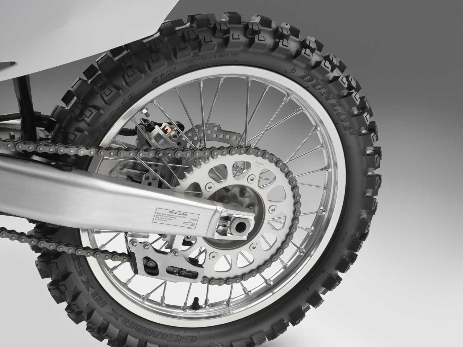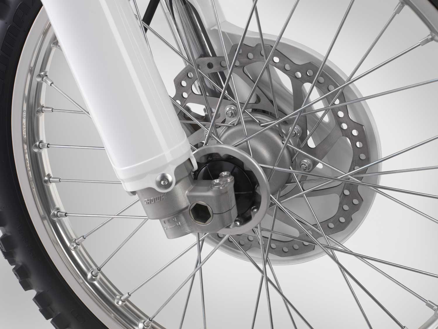 Lightweight aluminium rims reduce unsprung weight. Both now wear top-specification Dunlop MX52F/MX52 80/100-21 front and 100/90-19 rear tyres which offer superb grip over a variety of conditions, with block-within-a-block knobs for more progressive side-grip and cornering, superior bump absorption from the sidewalls and recessed carcass design plus increased durability.
