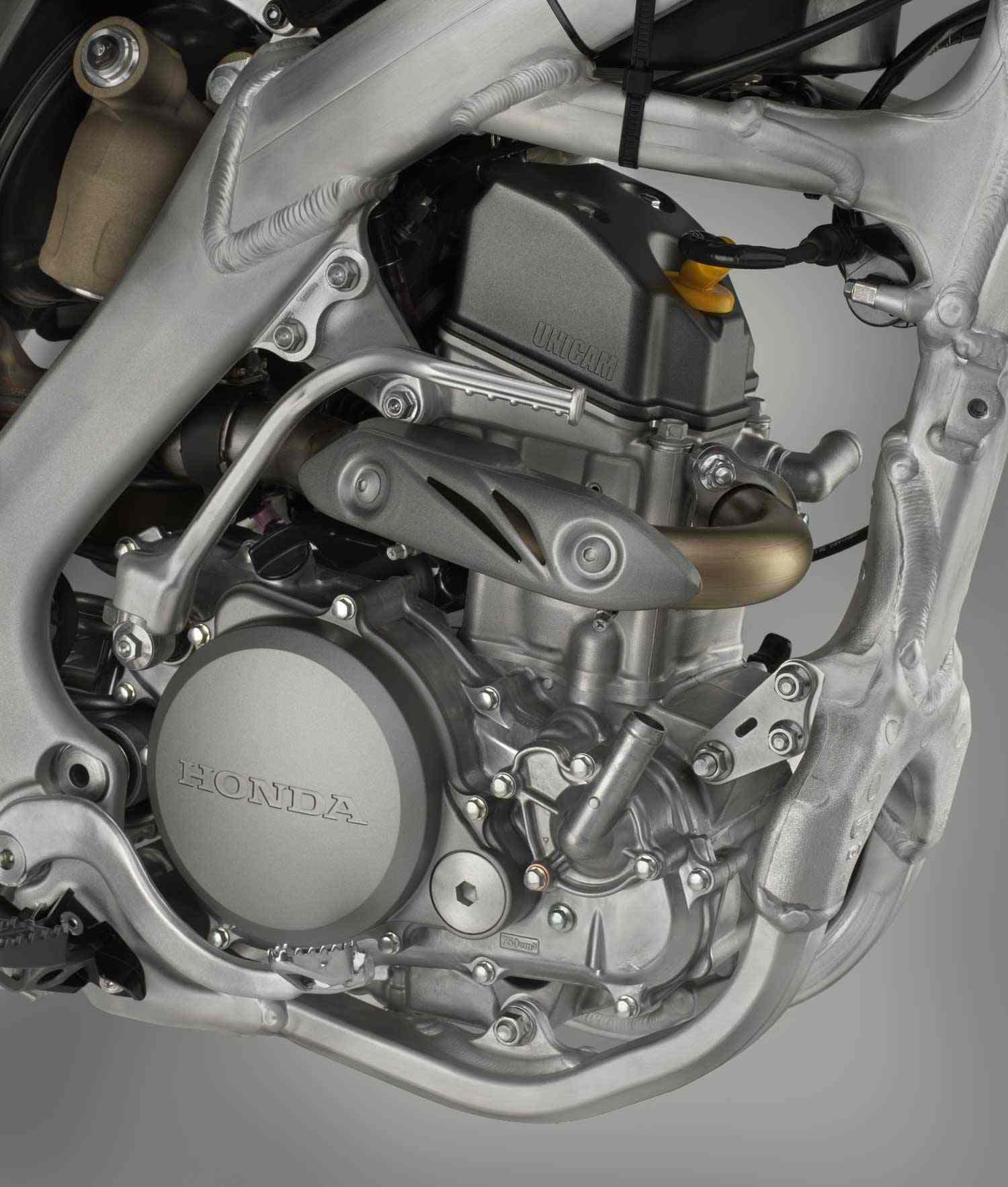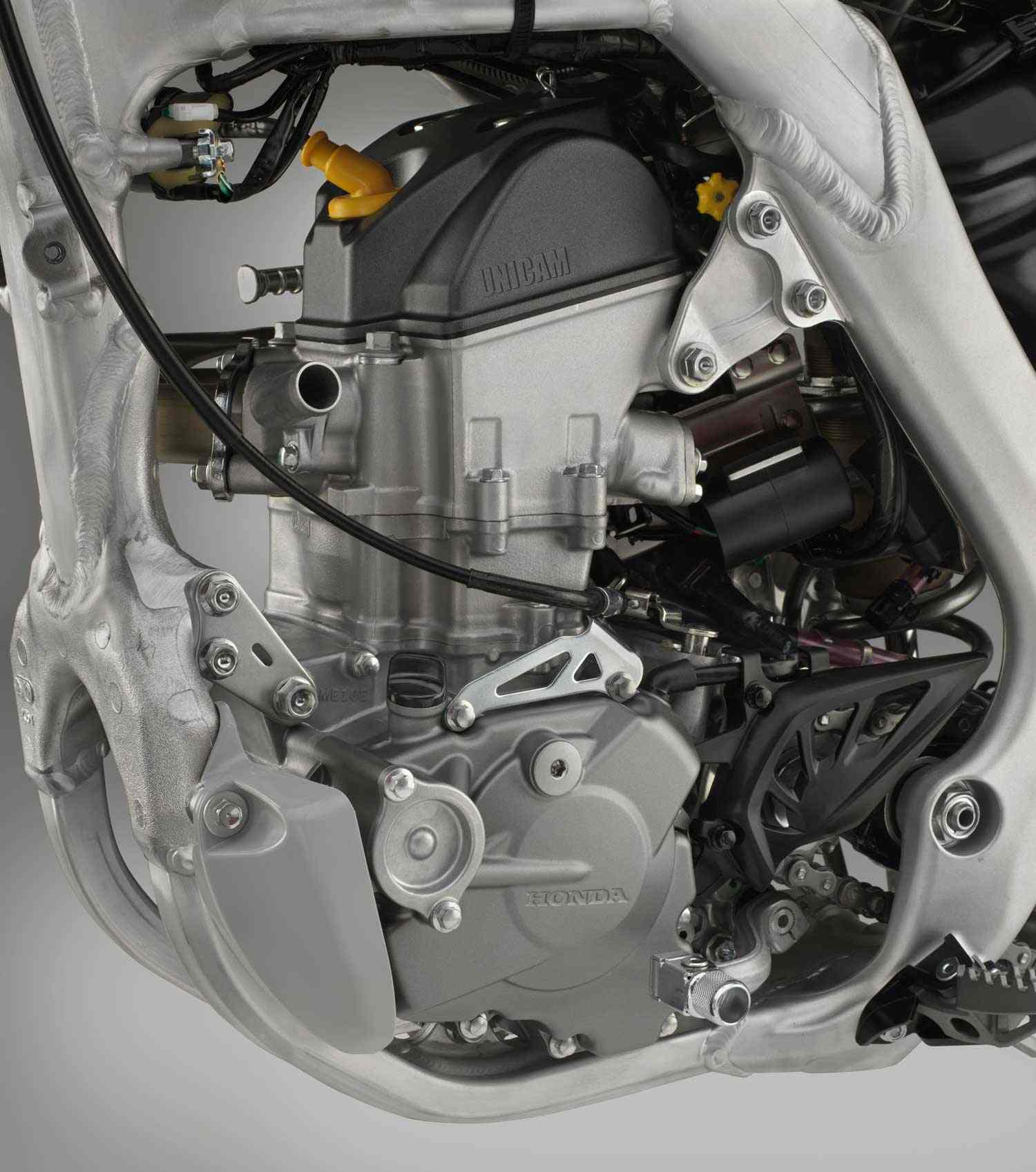 PGM-FI Dual Fuel Injection is fed by a CRF450R specification airbox married to a dedicated CRF250R air boot and features revised mapping to suit the free-breathing exhaust. It uses a lighter throttle return spring on the 46mm throttle body to reduce effort. In FIM form peak power of 28kW arrives @ 11,000rpm, with peak torque of 26.5Nm delivered @ 8,500rpm.