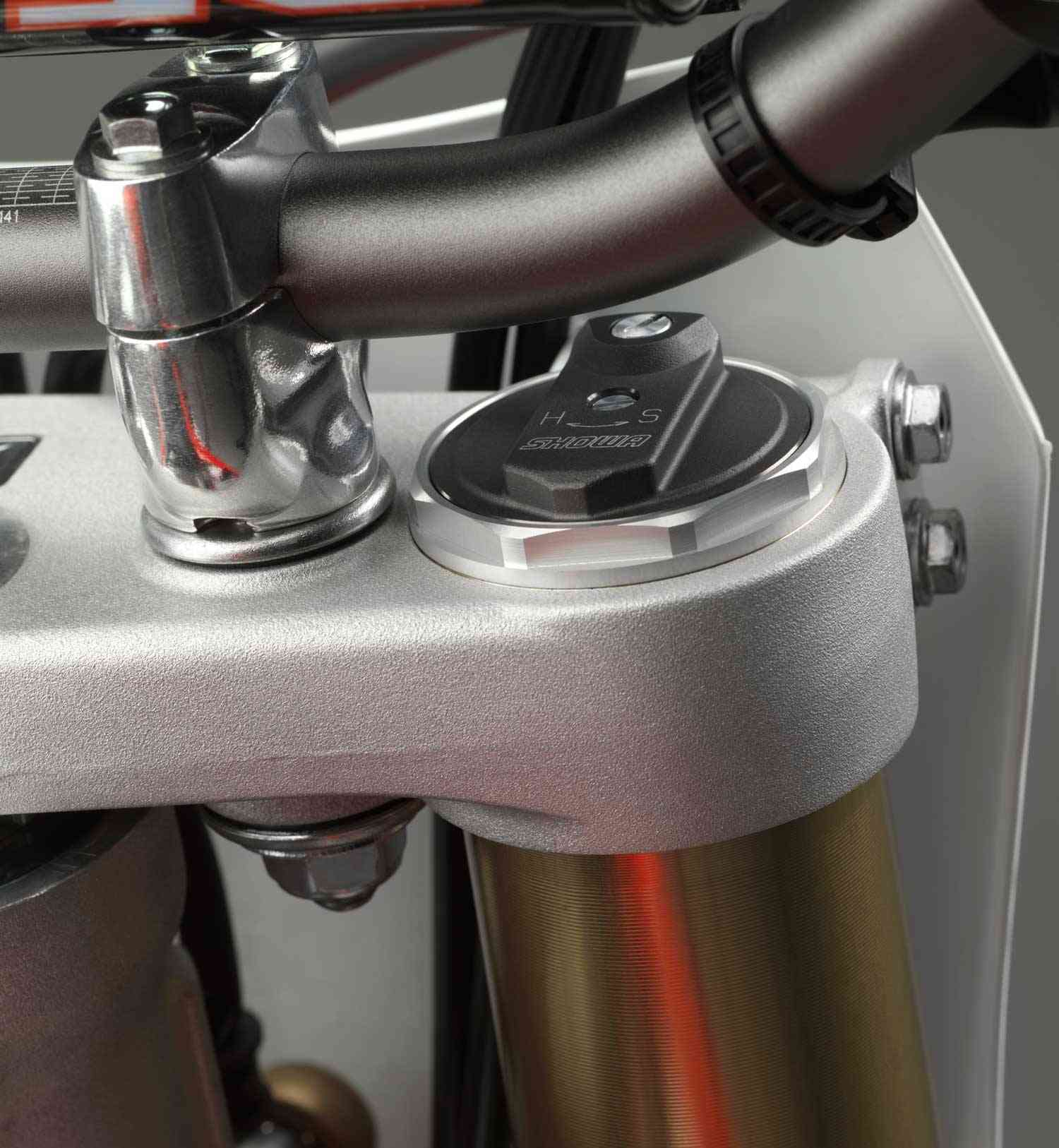 The Separate Front Function AIR (forks) with Triple Air Chamber (SFF-AIR-TAC) unit has been developed specifically for the unique demands of a 250cc competition machine. It’s much lighter than the steel sprung fork it replaces and separates the damping and compressions functions between the right and left fork legs. A new spring material for the Showa rear shock is both stronger and lighter.