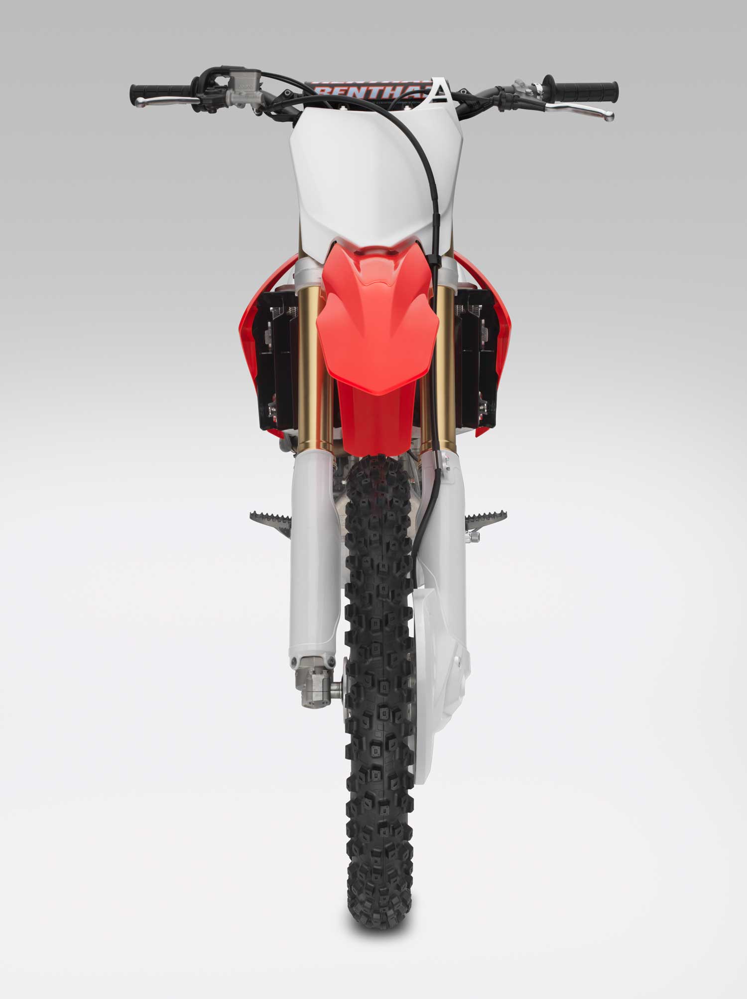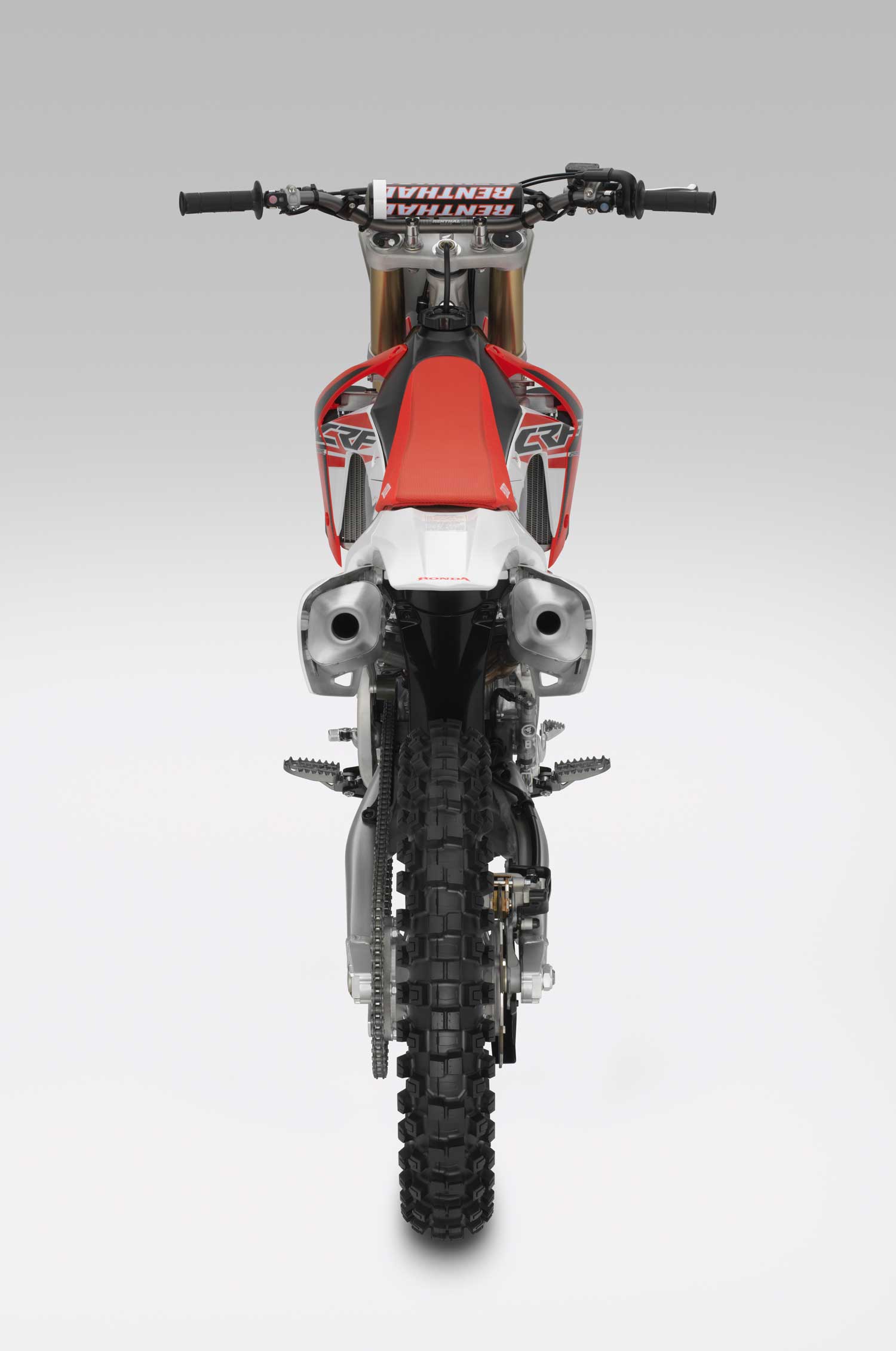 Honda’s Pro-Link rear suspension linkage operates CRF250R-specific ratios and allows 31.7cm of travel. Fully adjustable, the rear shock features 17-position rebound adjustment; compression damping is separated into 13-position (low-speed) and 3.5 turns (high speed).