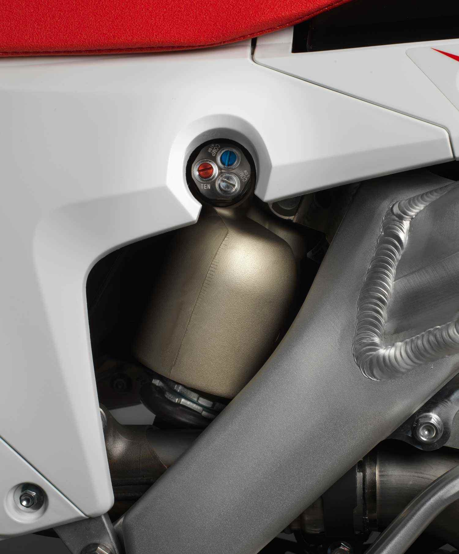 Having re-written the rules of front-end feel 2 years ago the 48MM KYB Pneumatic Spring Forks (PSF) units have now moved on to the next level (PSF2) and receive redesigned, lighter internals plus approximately 10% friction reduction. High and low-speed rebound damping adjustment joins the other adjusters on the fork tops; the rear shock’s adjusters have also been rationalised together.