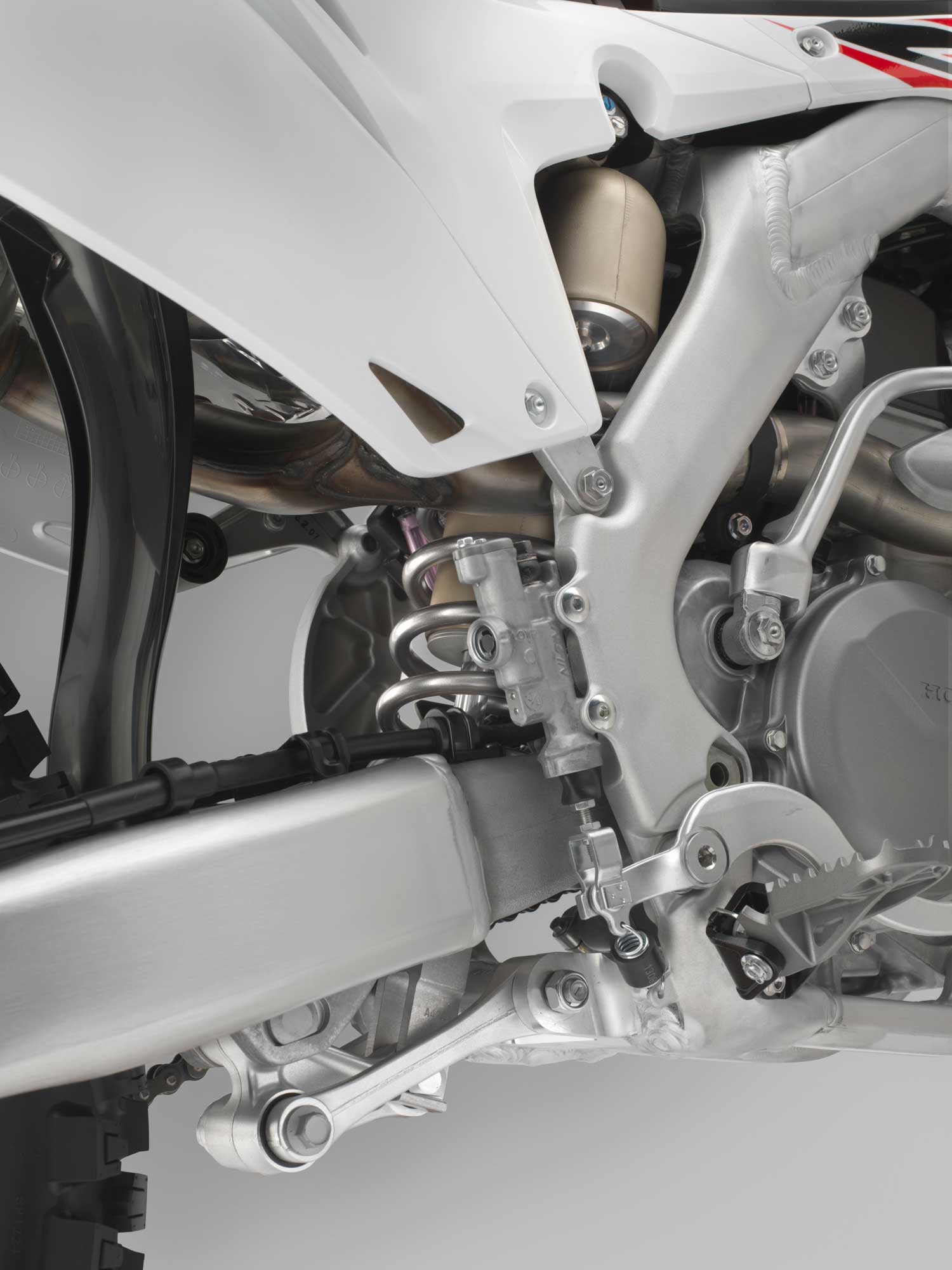 Further internal upgrades are designed to improve durability. The left crankcase material is thicker around the crankshaft bearing and pivot point. To cope with the increase in power the piston now shares the CRF250R’s heat treatment process. Every gear except first is now manufactured from Nickel Chrome Molybdenum.