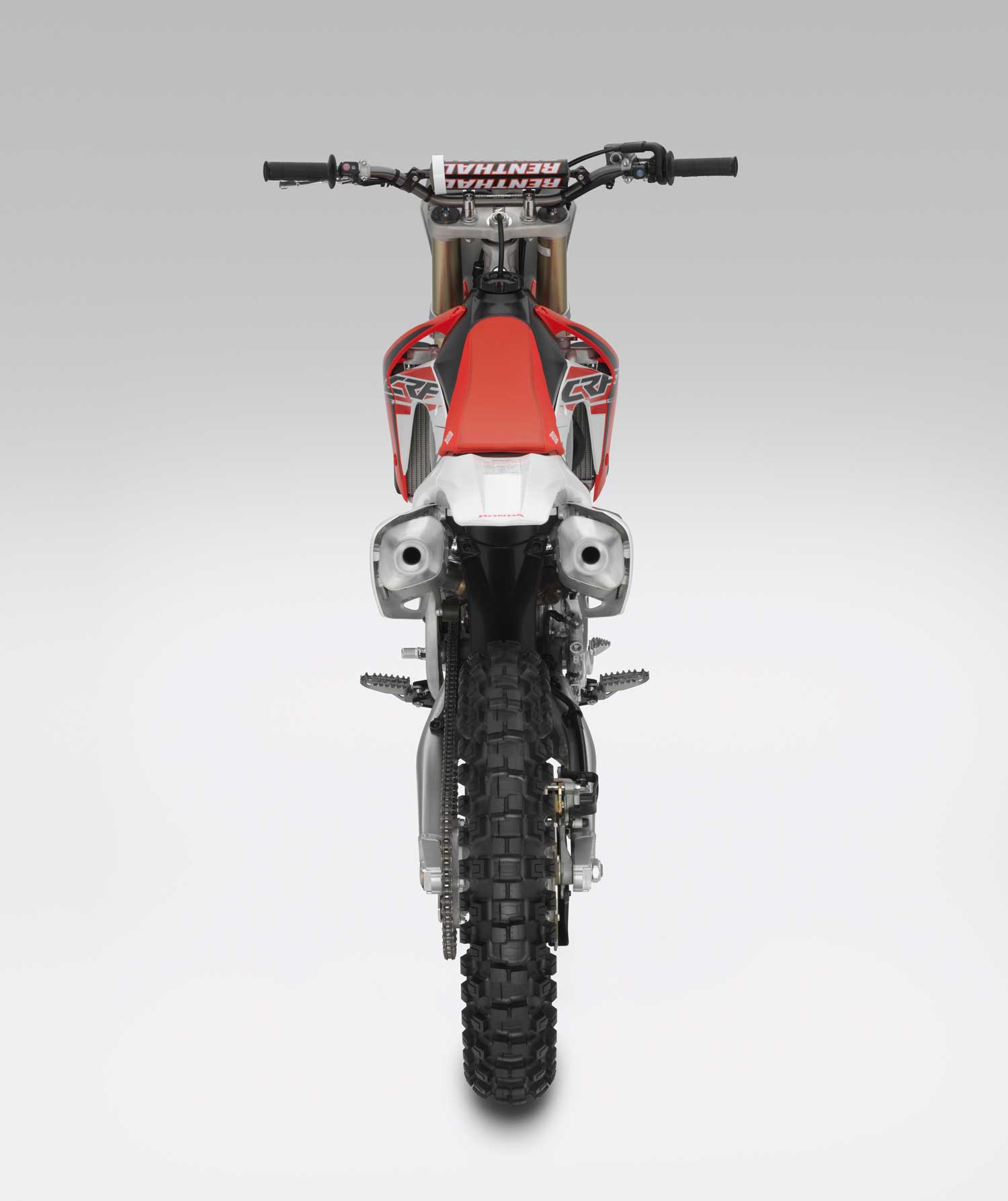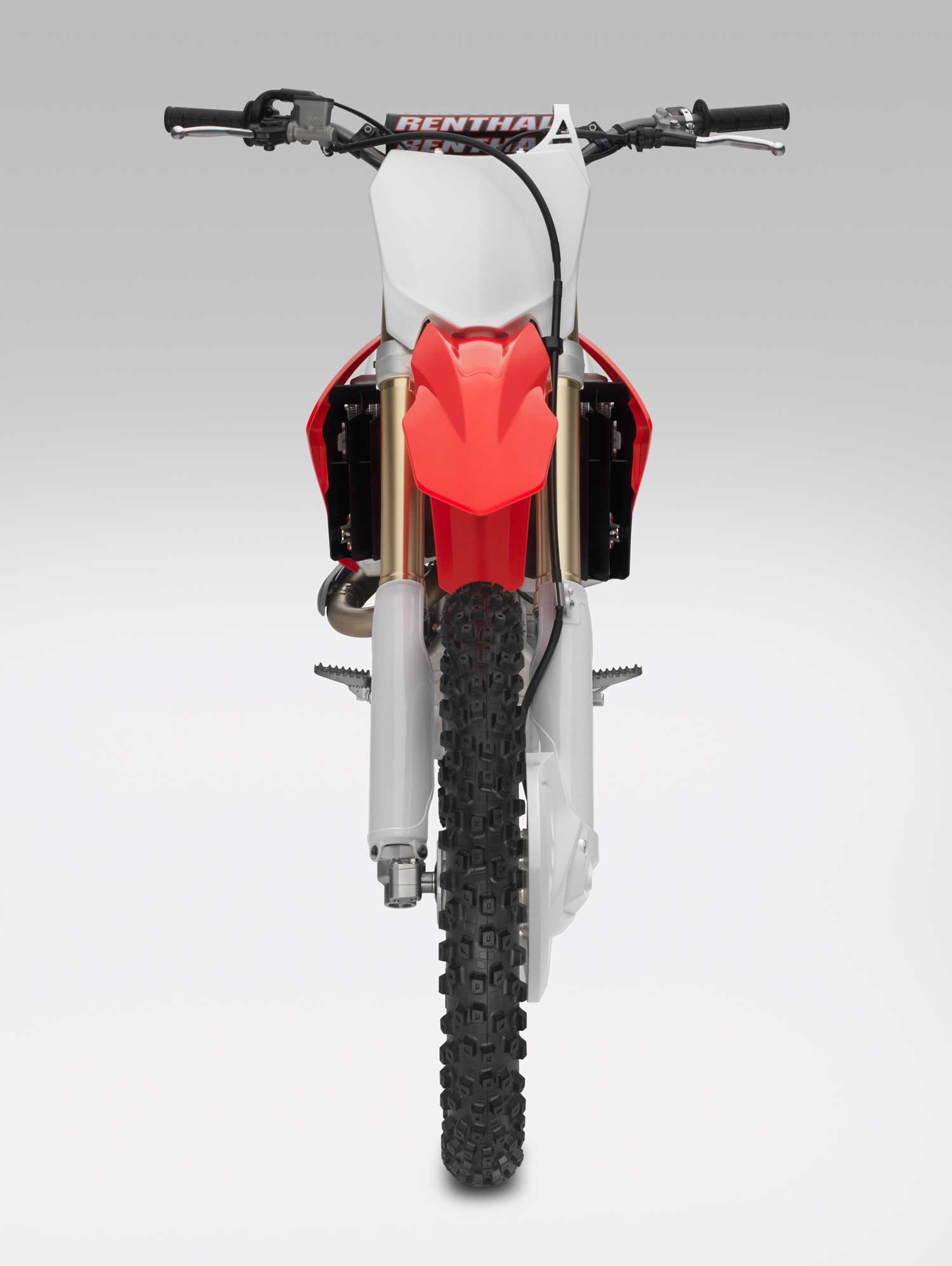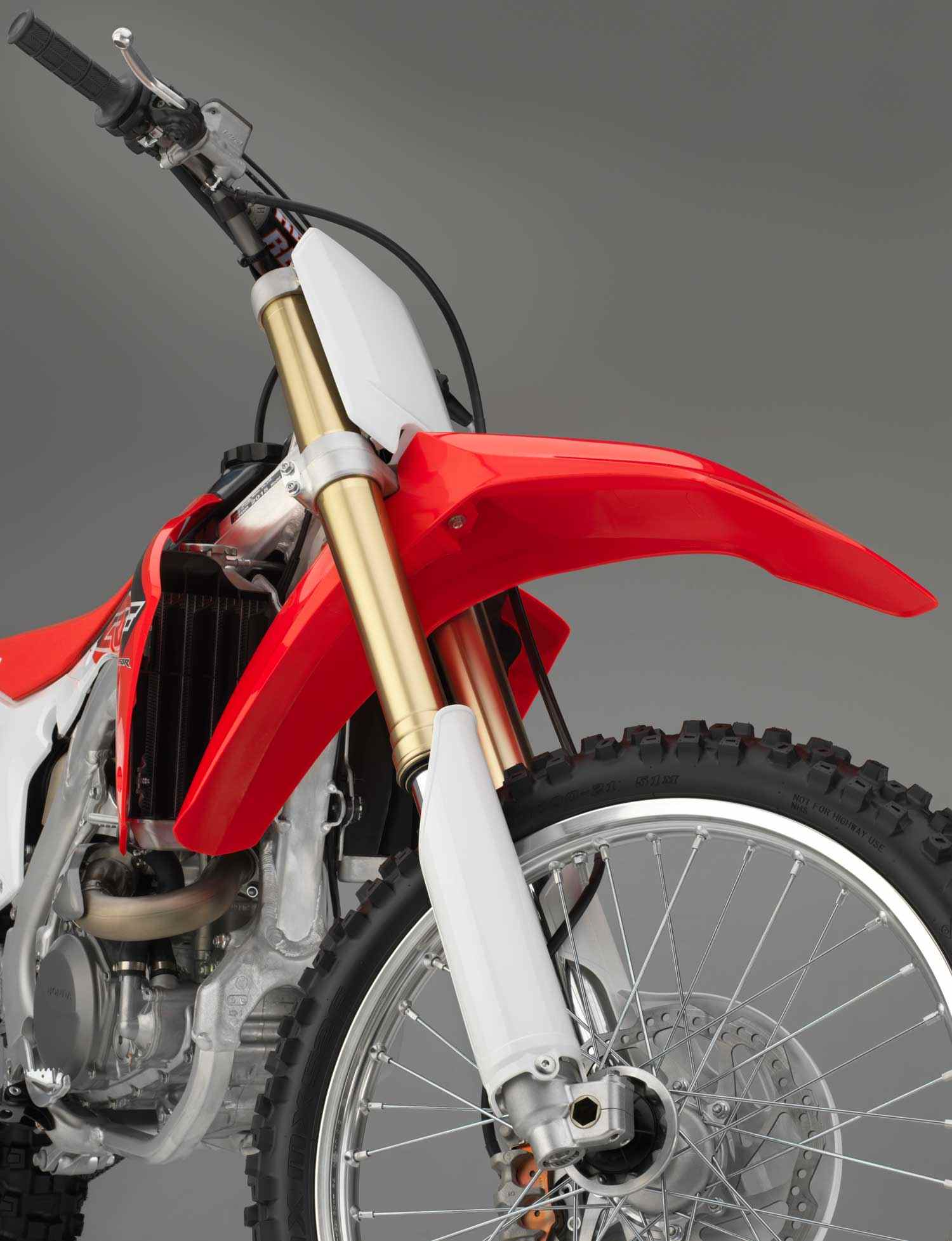 Lightweight aluminium rims, with directly attached spoke pattern layout reduce unsprung weight; the front is a 21 x 1.6in, the rear a 19 x 2.15in. Both now wear top-specification Dunlop MX52F/MX52 tyres which offer superb grip over a variety of conditions, superior bump absorption from the sidewalls and recessed carcass design plus increased durability.