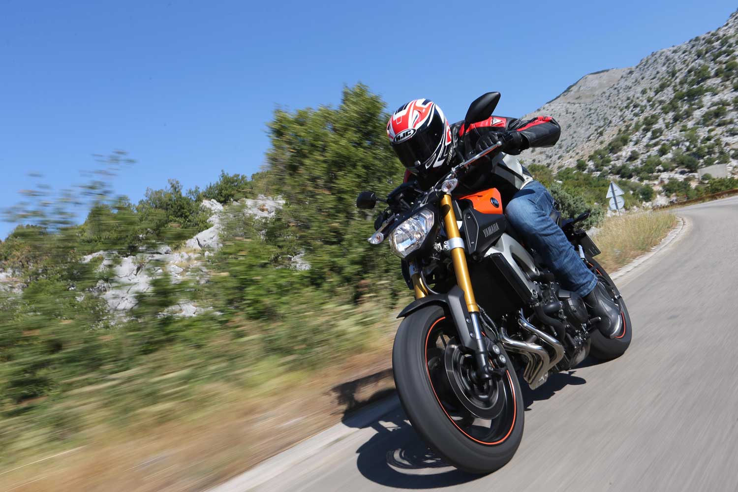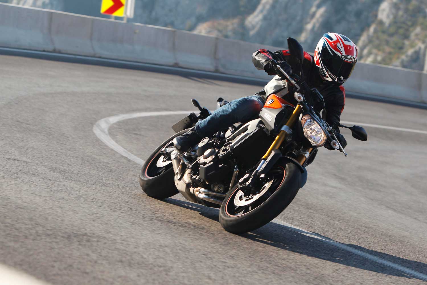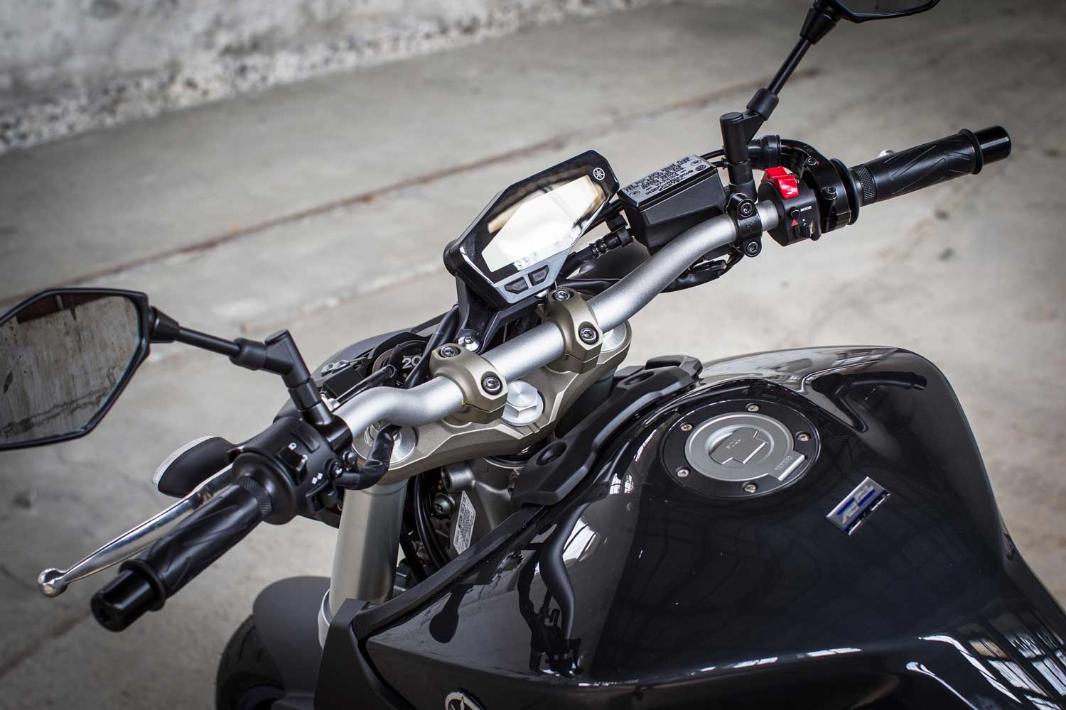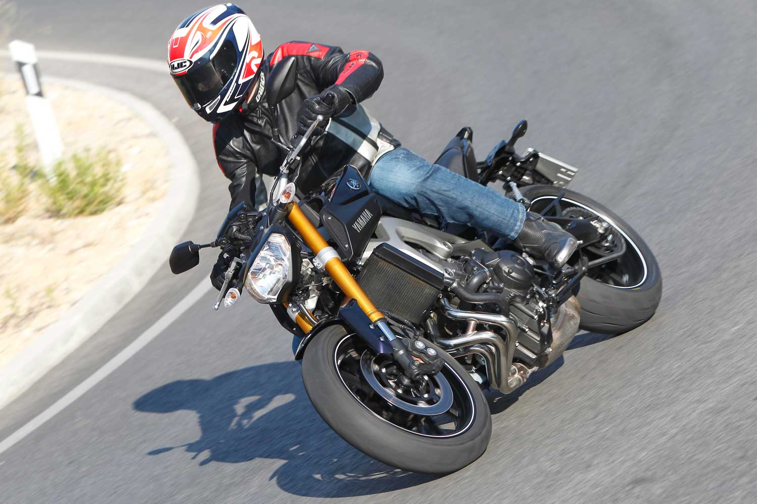 The chassis follows the engine by being essentially sound, but not perfectly sorted. The basics are in place, notably that beefy yet light aluminium frame and swing-arm, plus sporty geometry that helps give the Yam a responsive, urgent feel. The MT steers with a slight nudge of those wide bars, too, yet stayed stable at speed in a straight line and through fast curves alike. But in slower turns it sometimes had a slightly nervous, twitchy feel.