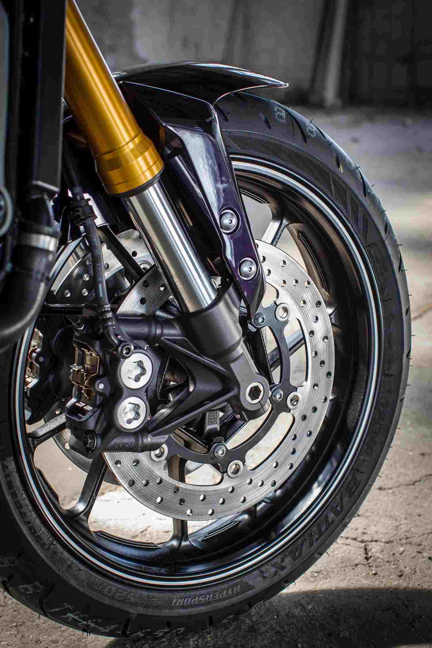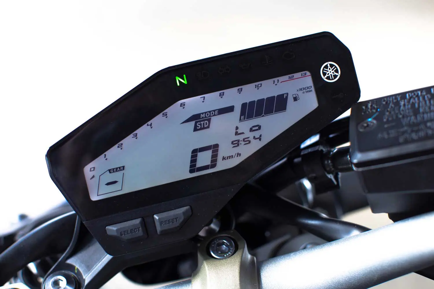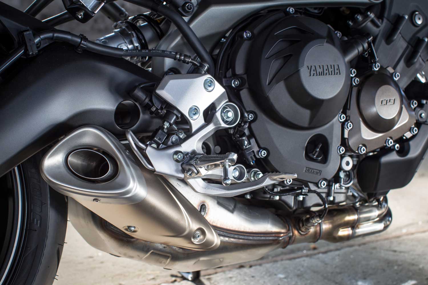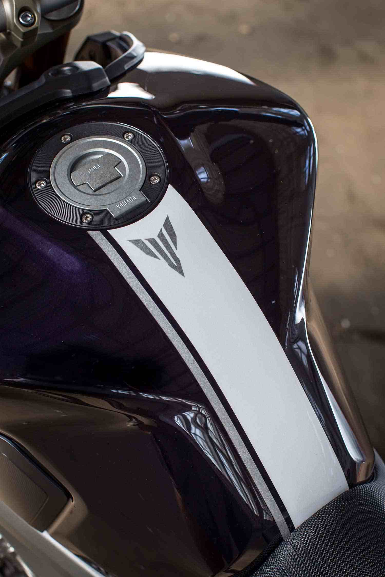 Throttle control is by a version of Yamaha’ YCC-T (Yamaha Chip Controlled Throttle), as on the R1 and R6. The intake trumpets are of different, though not variable, lengths, which Yamaha says “creates complimentary power and torque curves”. There’s no traction control. The three riding modes, selectable via a button on the right bar, vary the speed that the butterflies are opened but don’t use different fuel maps.