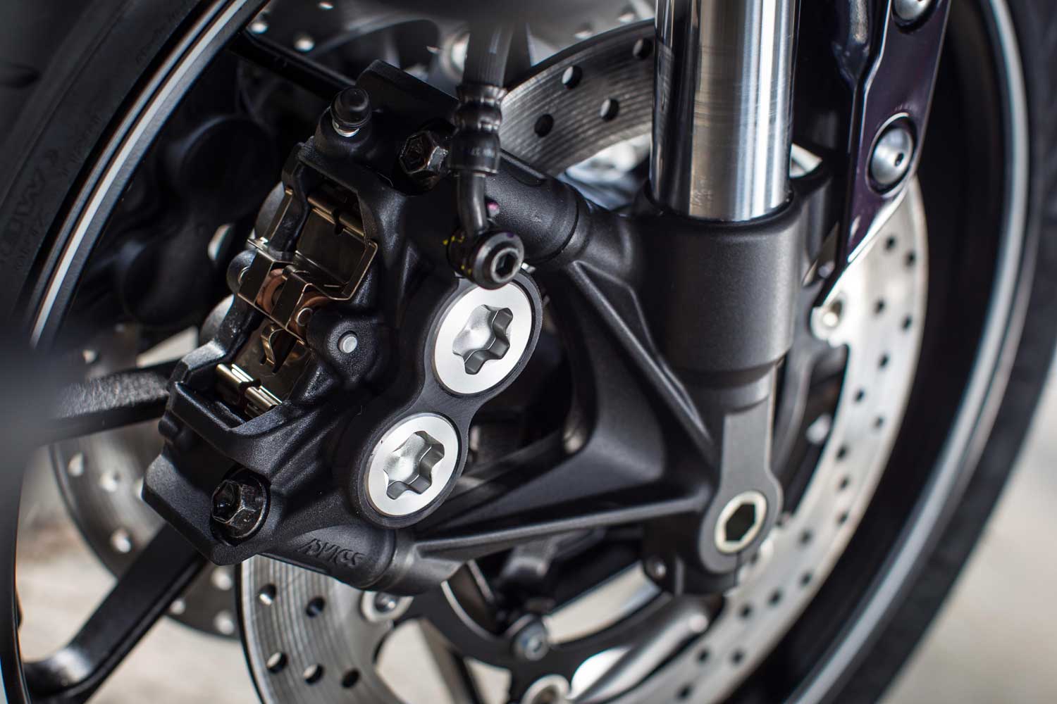 Most other chassis bits worked well, including the brakes, with the twin front discs and four-pot radial monobloc calipers having plenty of bite if not quite as much feel as some systems. The launch bikes were the non-ABS equipped models. I’d be tempted to choose the ABS model although it’s £400 more expensive, at £7349.
