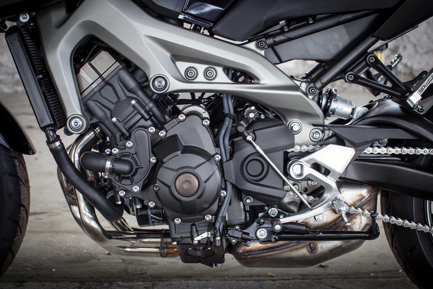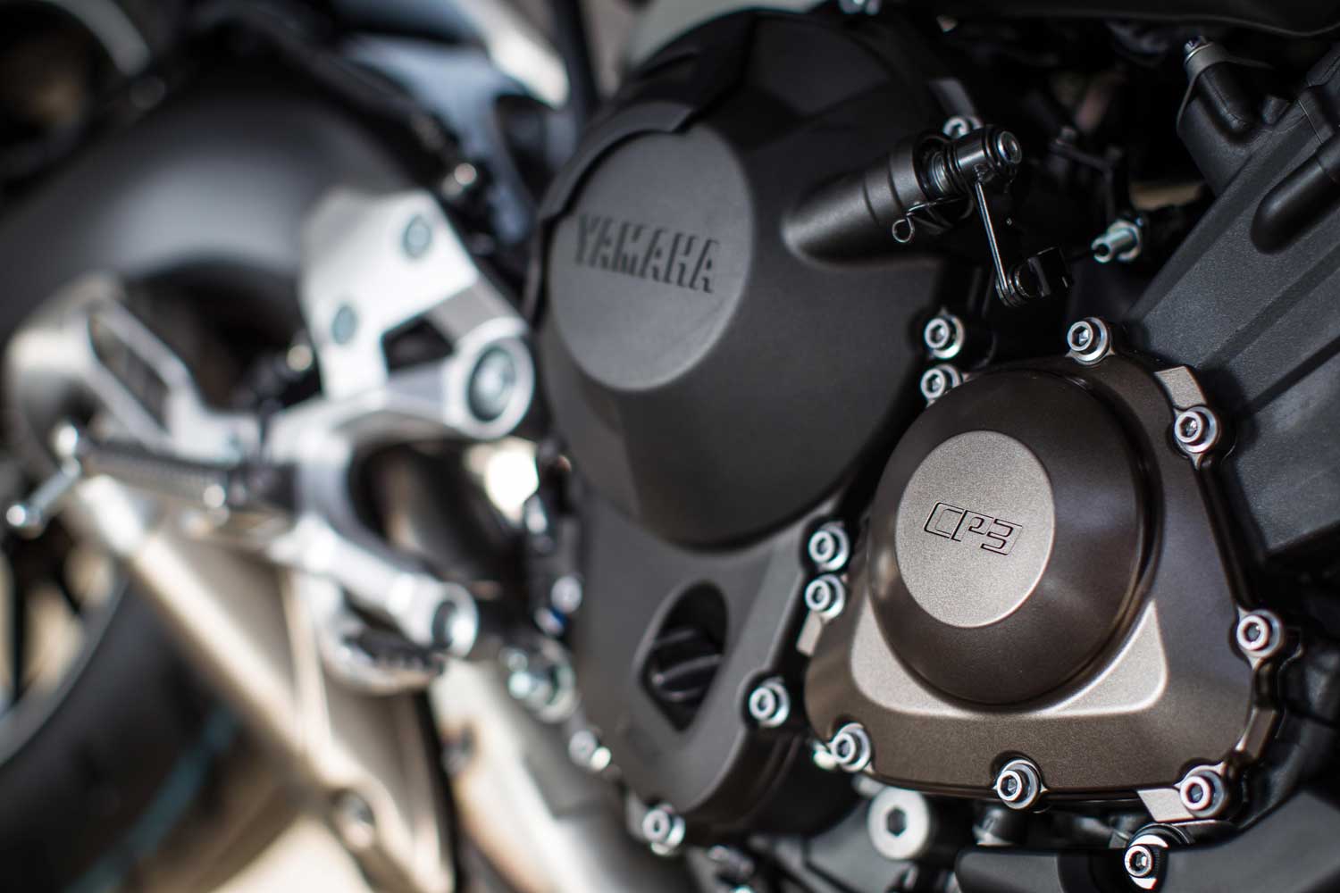 The liquid-cooled, dohc 12-valve triple is designed for midrange torque as much as for horsepower. Its peak output of 113bhp is high for such a light bike, and the MT makes considerably more torque throughout the rev range than the FZ8’s four-cylinder unit, despite weighing 10kg less, at 60kg. The 120-degree crankshaft engine’s cylinders are inclined forwards at 42.5 degrees, and are offset by 5mm from the crank, which helps minimise friction by reducing sideways force on the pistons.
