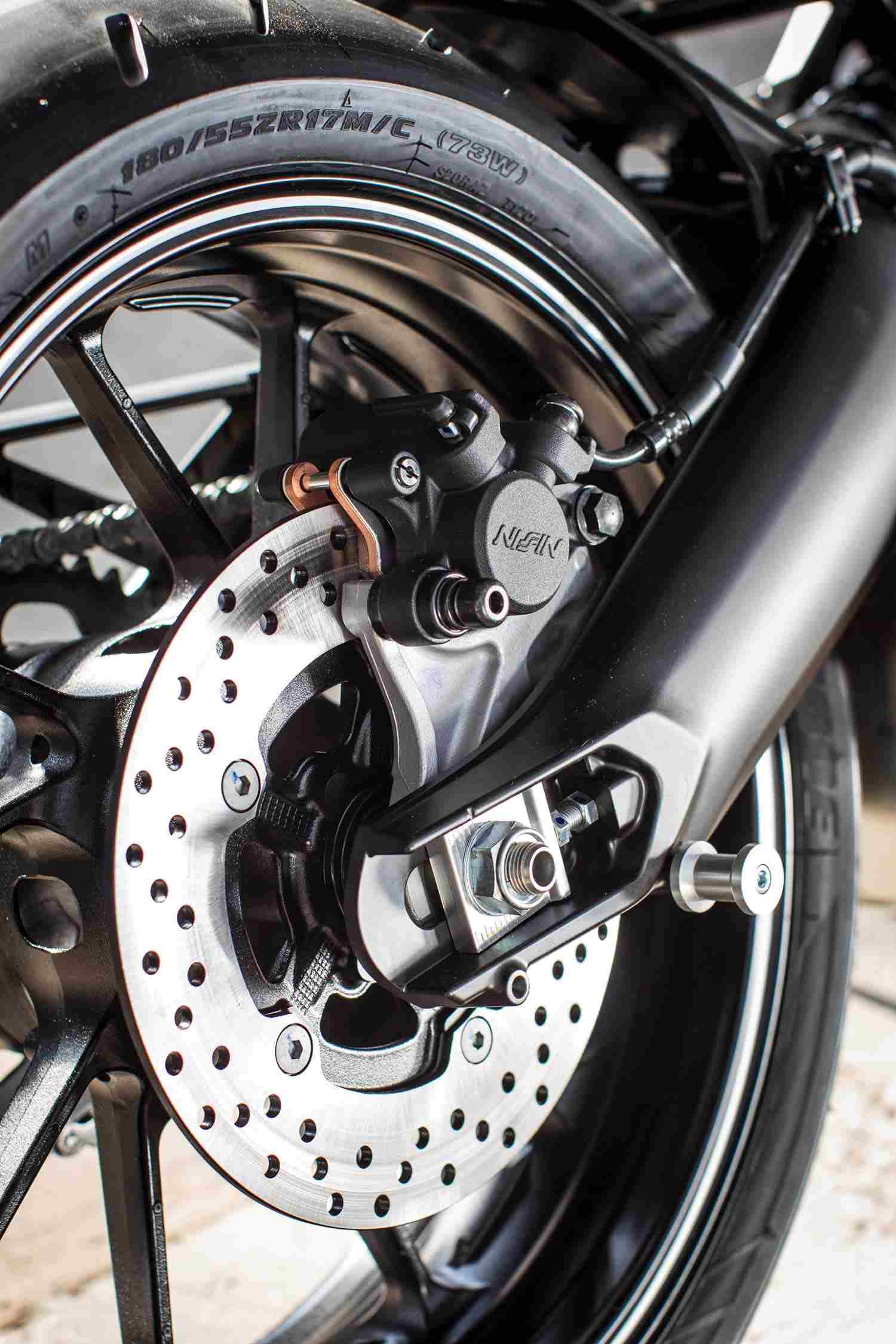 The die-cast aluminium frame is made in left and right halves, which are bolted together at steering head and swing-arm pivot. The die-cast swing-arm is welded together with extruded cross-members for extra rigidity. The swing-arm pivot is on the outside of the frame, reducing width around the footrests and allowing a high static lean angle of 51 degrees. That claimed wet weight figure of 188kg is a kilo lower than that of Yamaha’s YZF-R6 super-sports four, which illustrates what a thorough job the MT’s designers did.