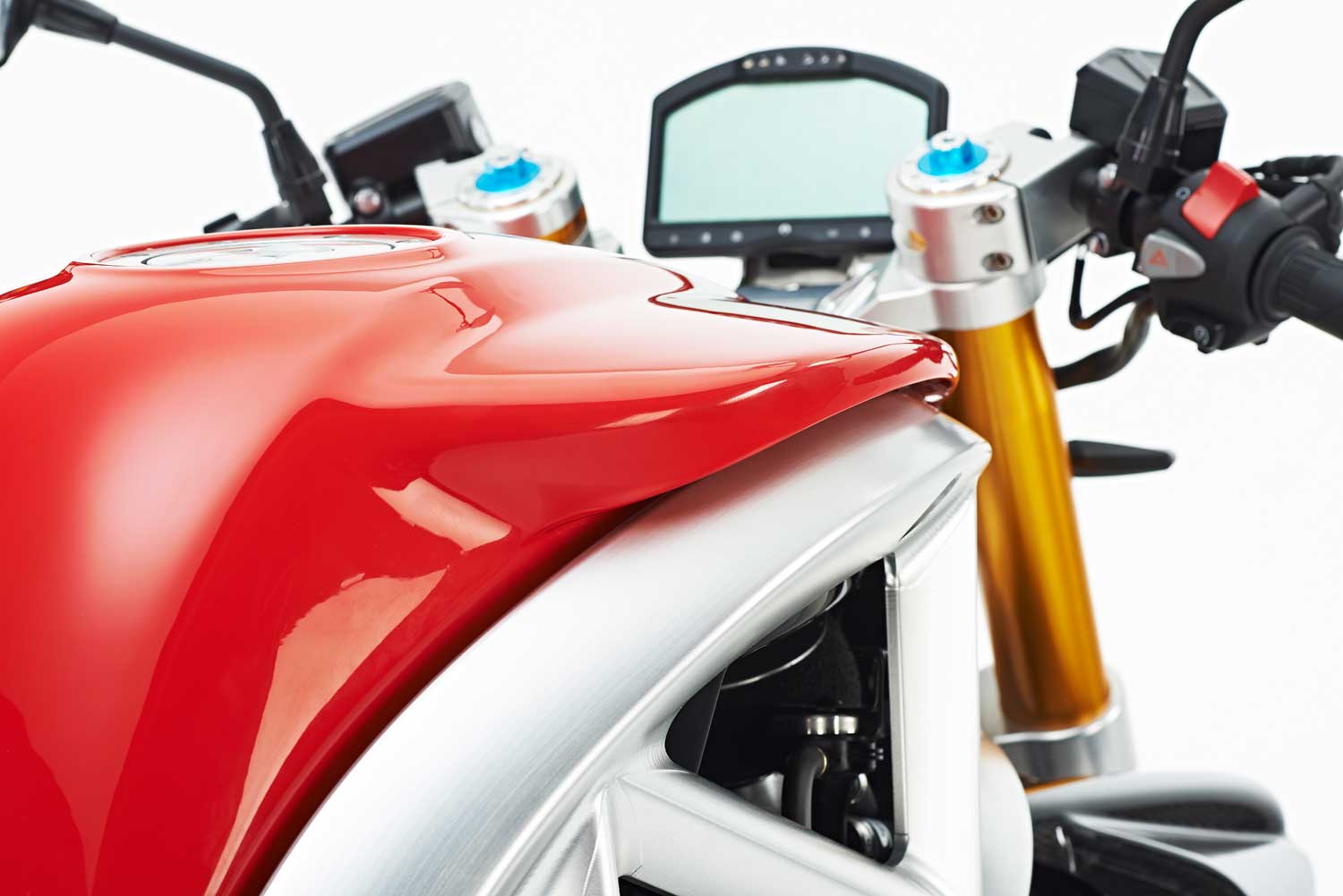 Front brakes are Nissin 320mm dual floating hydraulic discs with 6 piston callipers while the rear are Nissin 276mm disc with 2 piston calliper (plus park brake with DCT transmission). All versions of the Ace have electronic ABS brakes together with switchable traction control. Options of Brembo brakes will be available when the Ace goes into production and once final testing has been signed off. Goodridge hose and fittings are used throughout the Ace for all brake and clutch lines with an option of Goodridge Kevlar hose and lightweight fittings.
