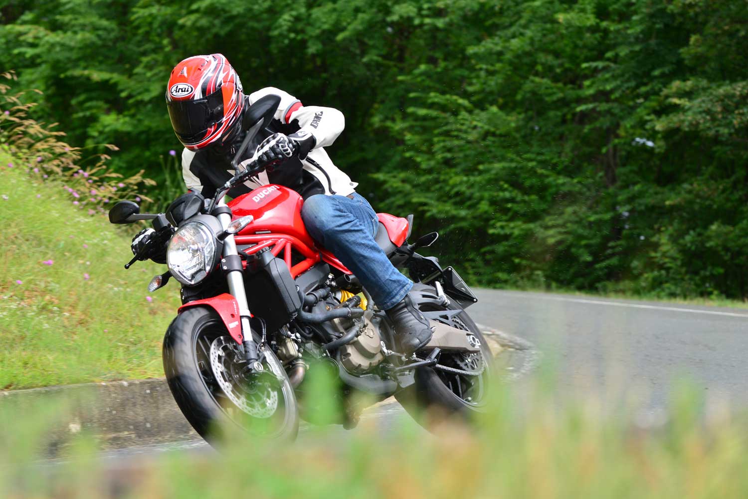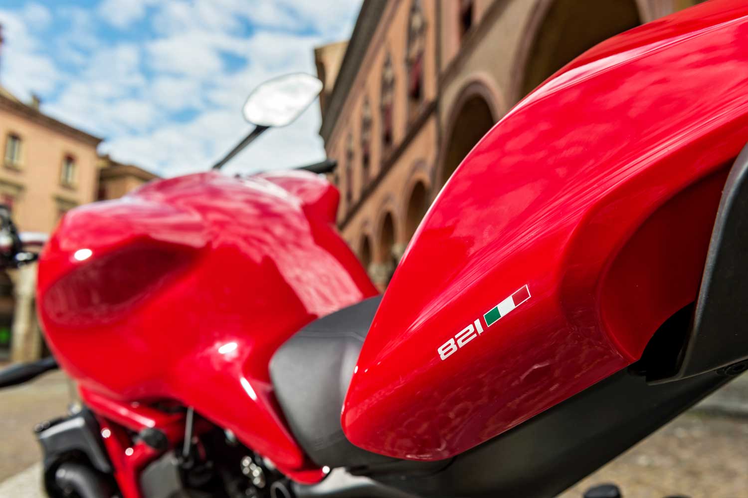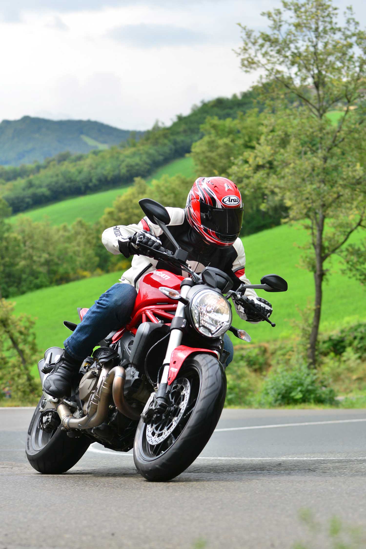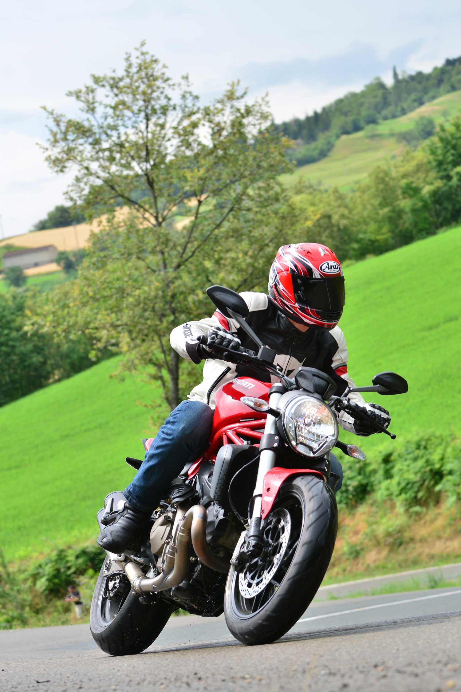 Ride quality was pretty good, the suspension giving a taut, reasonably firm feel while soaking up bumps with notably more efficiency than Monsters of a few years ago. Hard riding on the twisty Futa pass near Bologna, where Ducati develops most of its bikes, occasionally had the 821 moving around slightly in bumpier bends, but it gave plenty of feedback and steered very precisely. The Brembo brake system is superbly powerful, and well backed up by the Bosch ABS system. The rear disc was typically lacking in feel but the ABS meant there was no worry about locking it up.