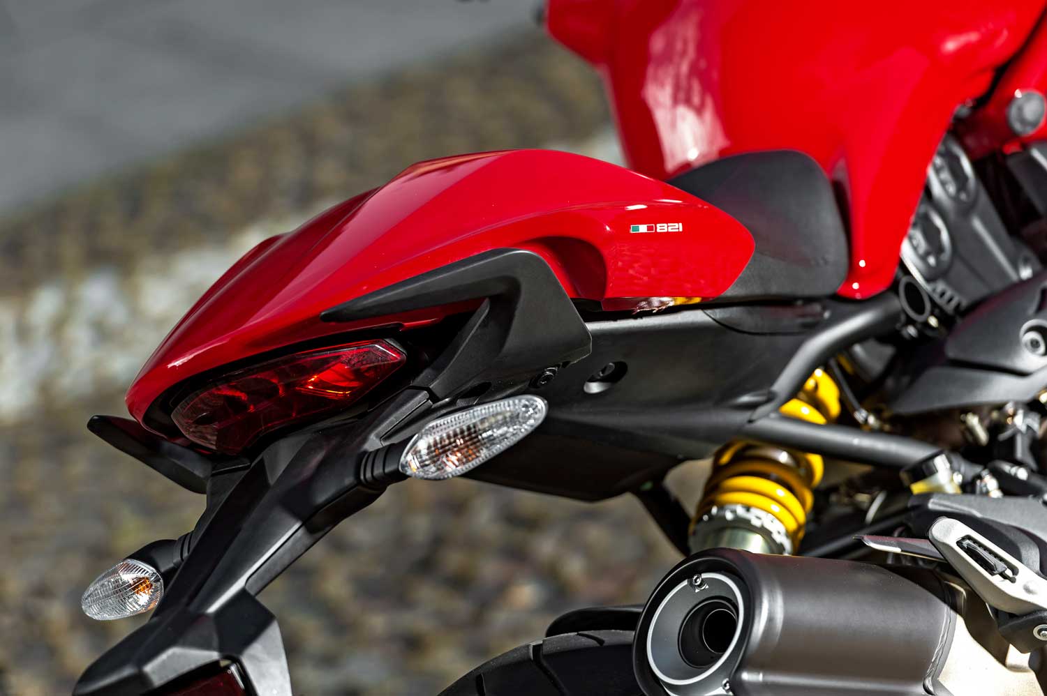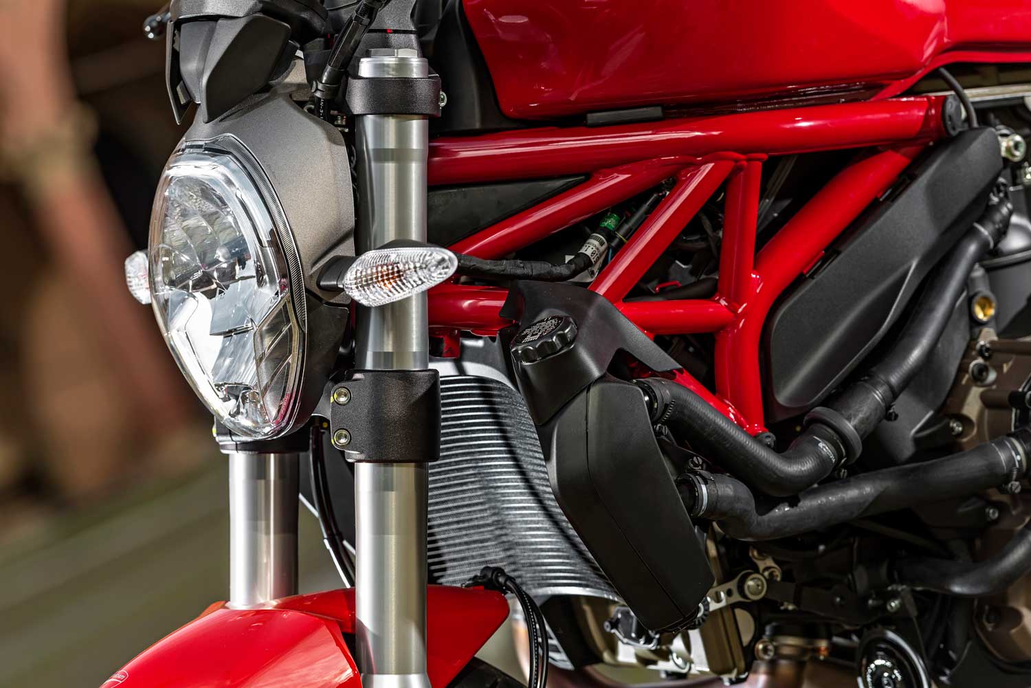The 821’s one-piece handlebar is made from steel instead of the 1200’s aluminium but the riding position is identical, thanks also to an unchanged seat that is wider, longer and better padded than previous Monster seats, and can be adjusted to be either 785 or 810mm high. Braking follows the standard 1200 model’s format, with 320mm front discs and Brembo radial Monobloc calipers, though the 821 doesn’t get the 1200’s radial master cylinder. Ducati’s “Safety Pack” of ABS brakes and eight-level traction control comes as standard.