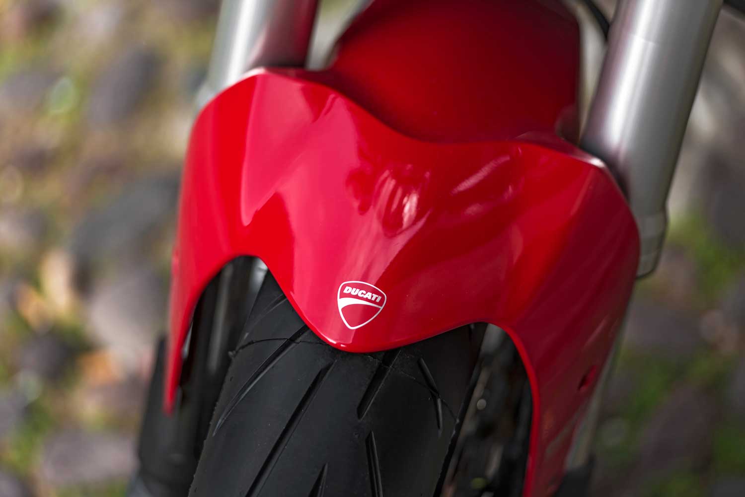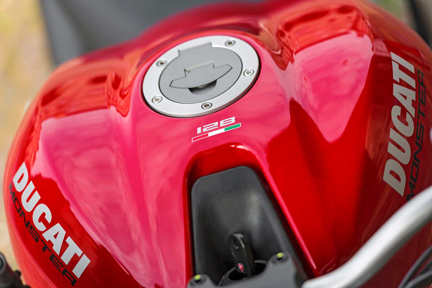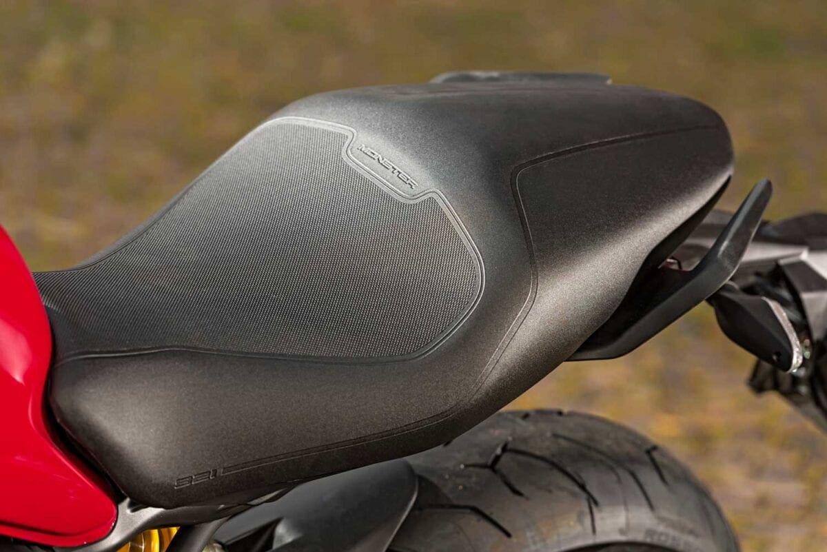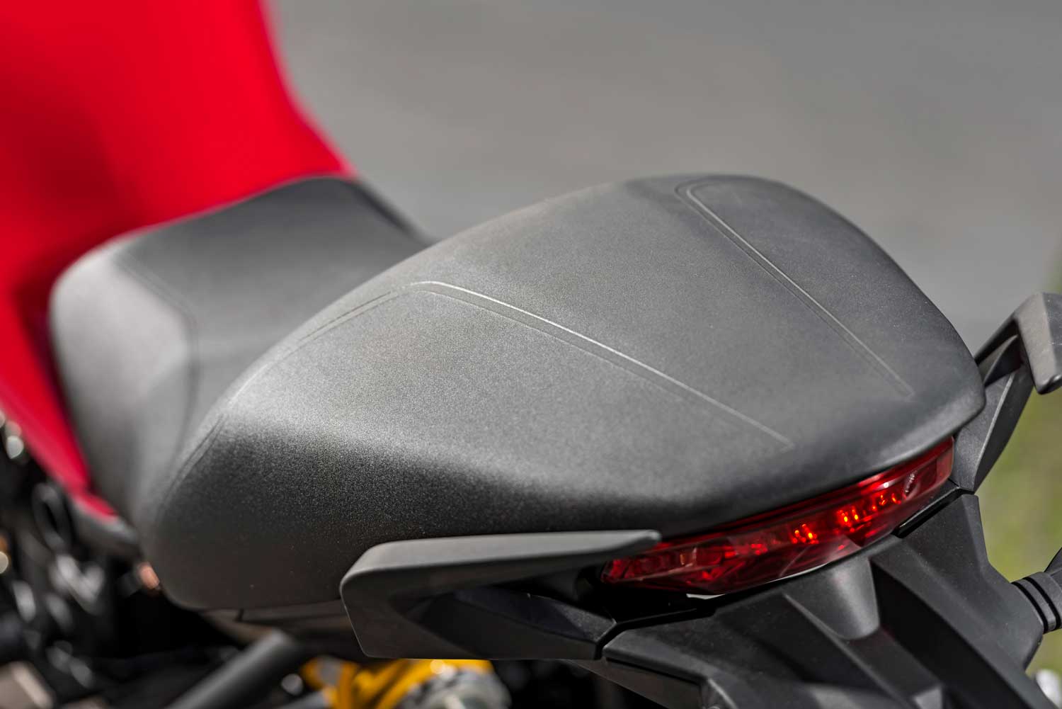 More importantly, Ducati have got the Monster’s basics well sorted. Its riding position is roomy; controls work smoothly; even the mirrors are useful. The 17.5-litre tank should be good for over 150 miles at a typical average of 45mpg or more. The seat was respectably comfortable, and removing its colour-matched pillion seat cover (standard fitment, except with the matt black Dark model) reveals a reasonably, if not generously, sized pillion seat with grab-handles alongside.