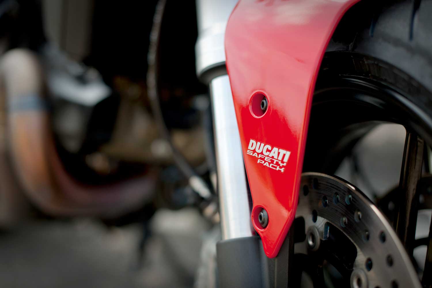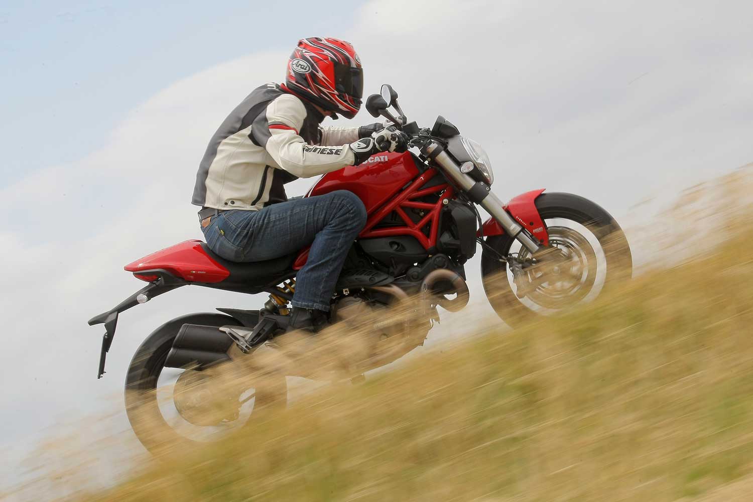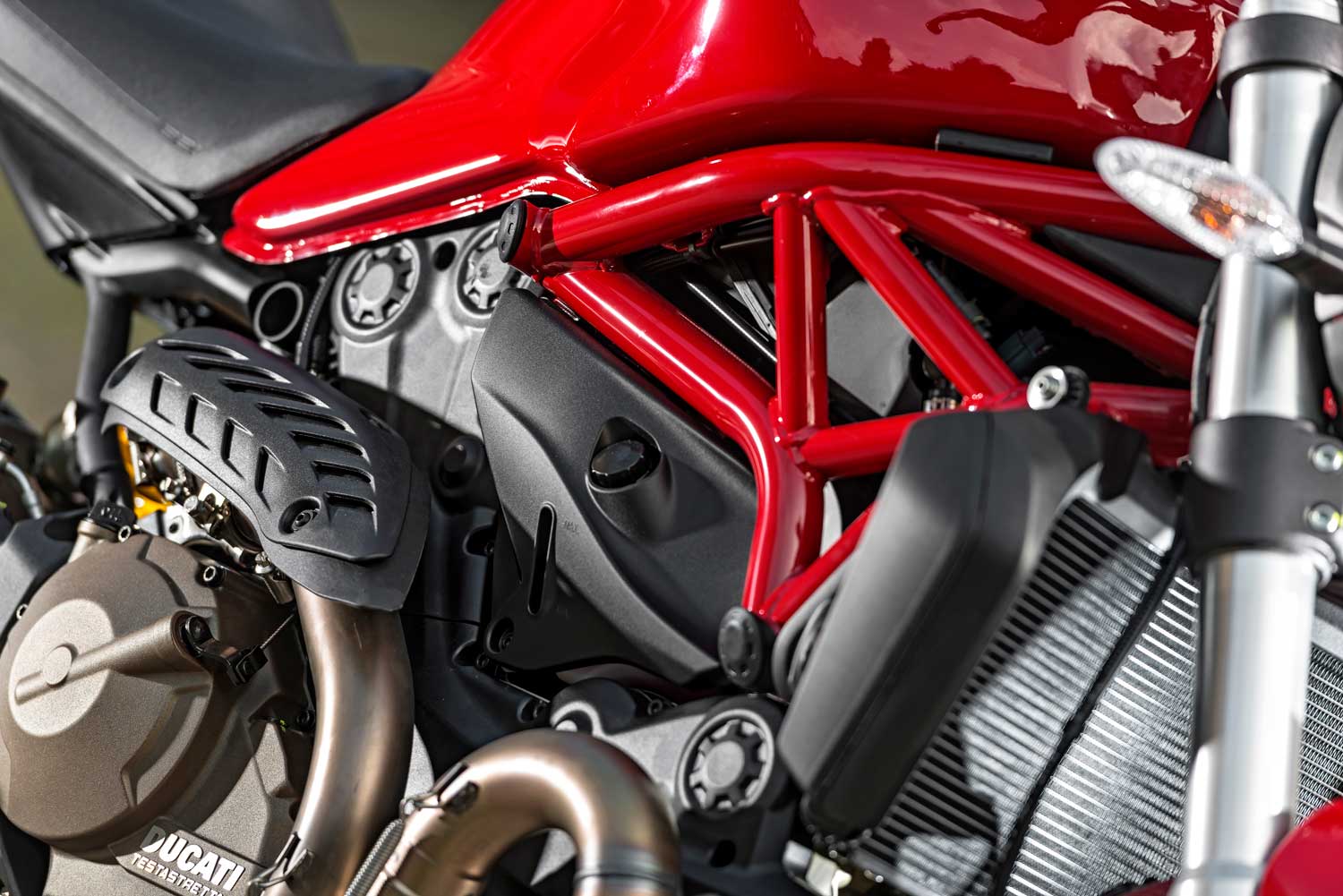 Relatively little engine development was required for this Monster because it’s powered by the DOHC eight-valve V-twin desmo unit that was introduced last year in the Hypermotard and Hyperstrada. The Testastretta 11 degree lump is mechanically unchanged apart from incorporating Ducati’s APTC clutch, which gives a slipper action and a very light feel at the lever.