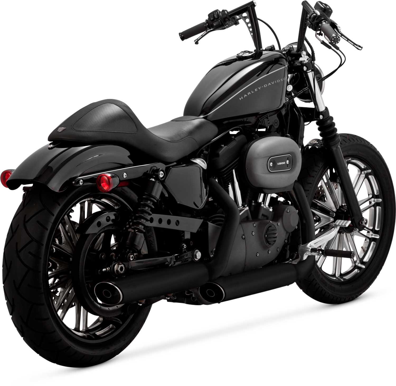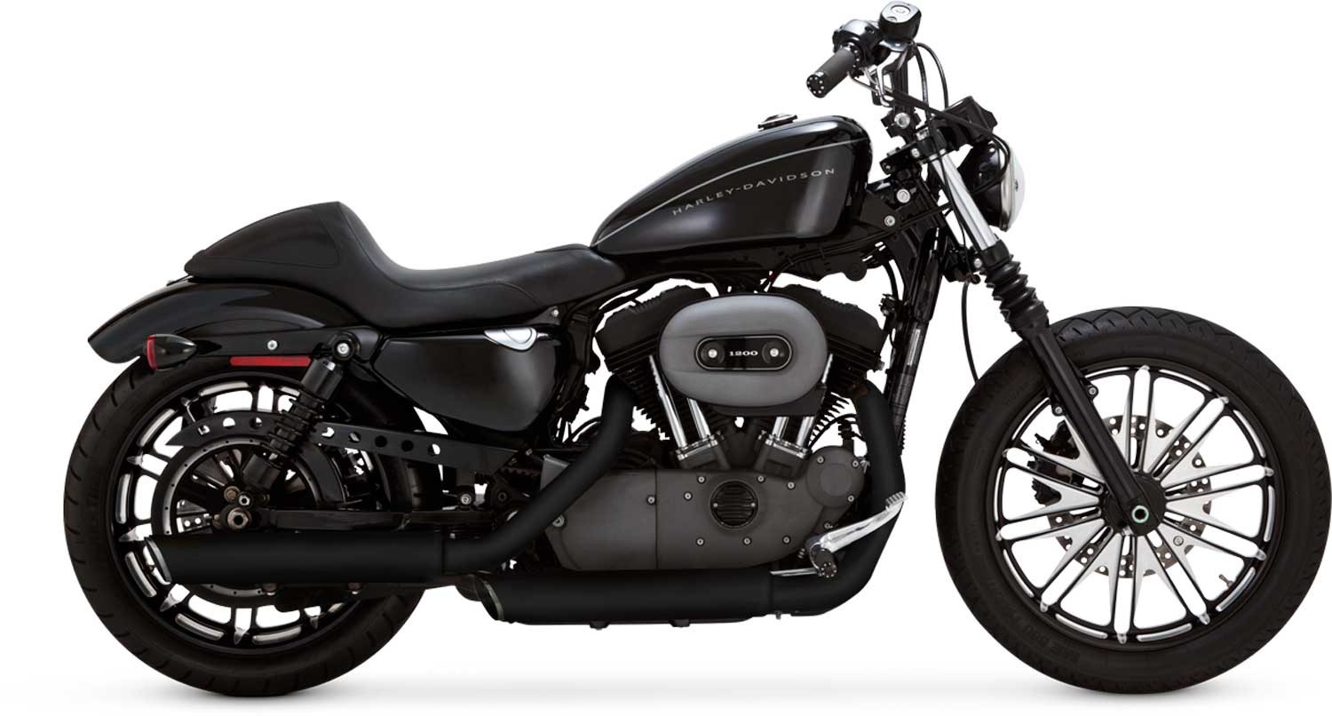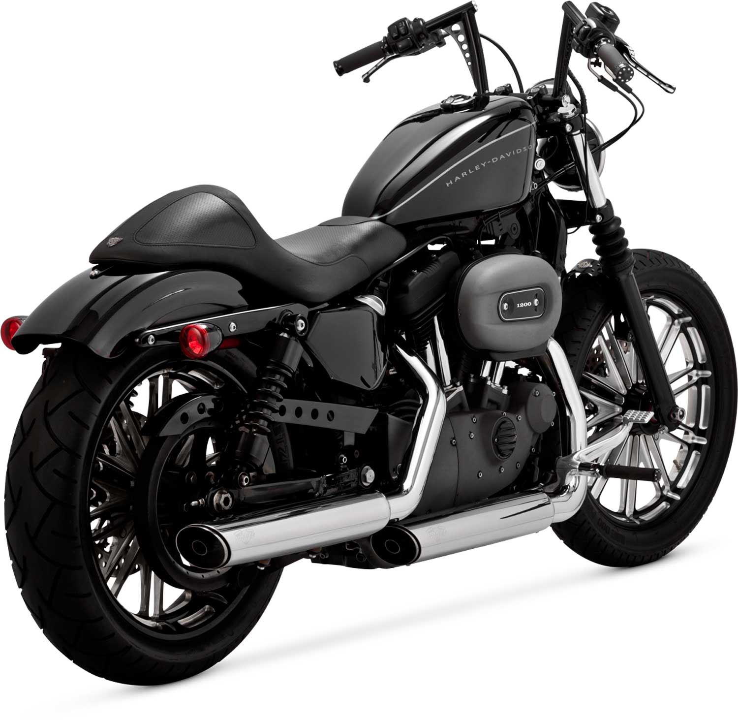 EC Twin Slash slip-ons are type approved for all 883cc and 1200cc Sportster models, including power restricted models from 2007-2013, are equipped with three-way catalytic converters to meet Euro 3 emissions standards and utilize a sound insert to meet the strict sound level standards enforced in the European Union. Chrome £709.91; Black: £797.80