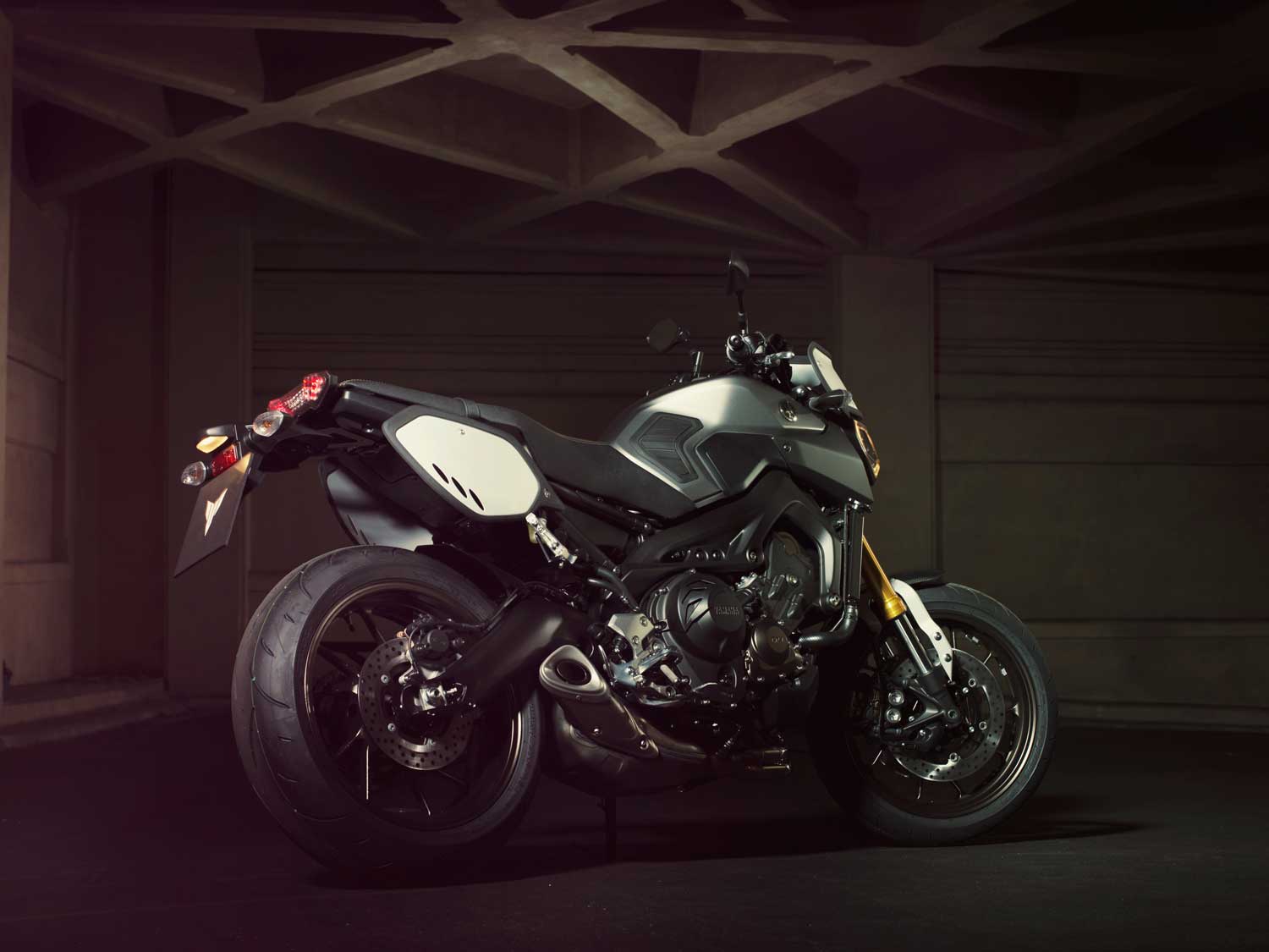 For the first time the MT-09 features a totally black frame, and the 850cc 3-cylinder engine is also treated in understated matt black and features a bronze coloured cylinder head, while the dark bronze wheels complement the gold coloured upside down forks to give a classy and authentic look.