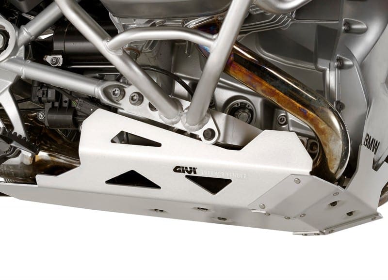 To keep the engine of the bike in perfect conditions, preventing damage from a fall or an unexpected shock, GIVI has created different protection guards for the upper part of the engine (TNH5108, with a price of £159.20) and for the lower part (the TN5108, priced at £164.58). The firm from Brescia also has a specific oil carter protector in aluminum, a radiator guard and a specific support in aluminum and stainless steel to widen the surface support area of the original side stand of the motorcycle.