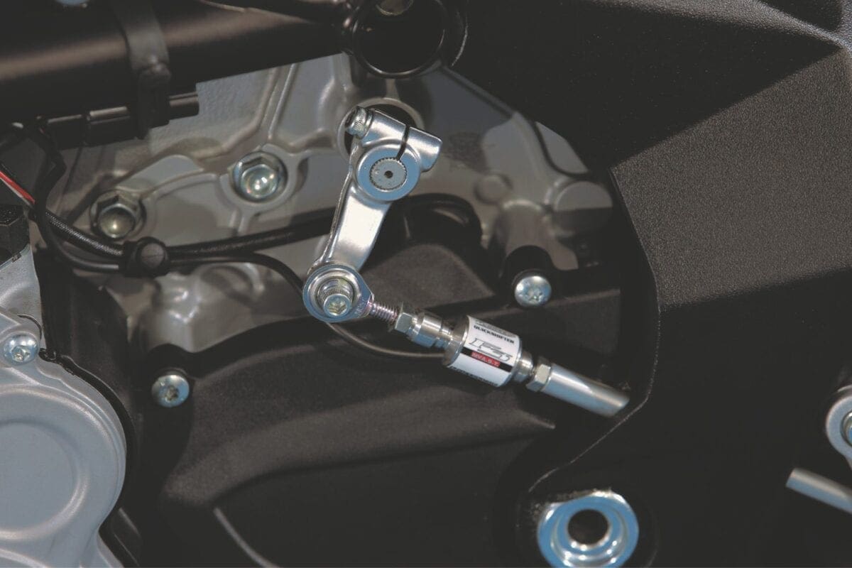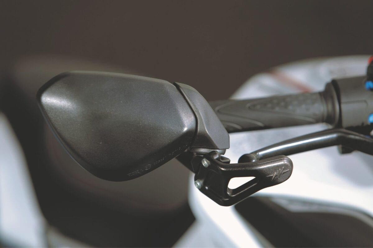 Suspension is racebike stiff, which means it gets more effective at controlling the bike the faster you go, resisting weight transfer and braking forces. But it’s also harsh, sending bumps into the chassis with a jarring crash. You’ll want to use the bike’s quick-witted steering to be dodging potholes, not blundering into them.