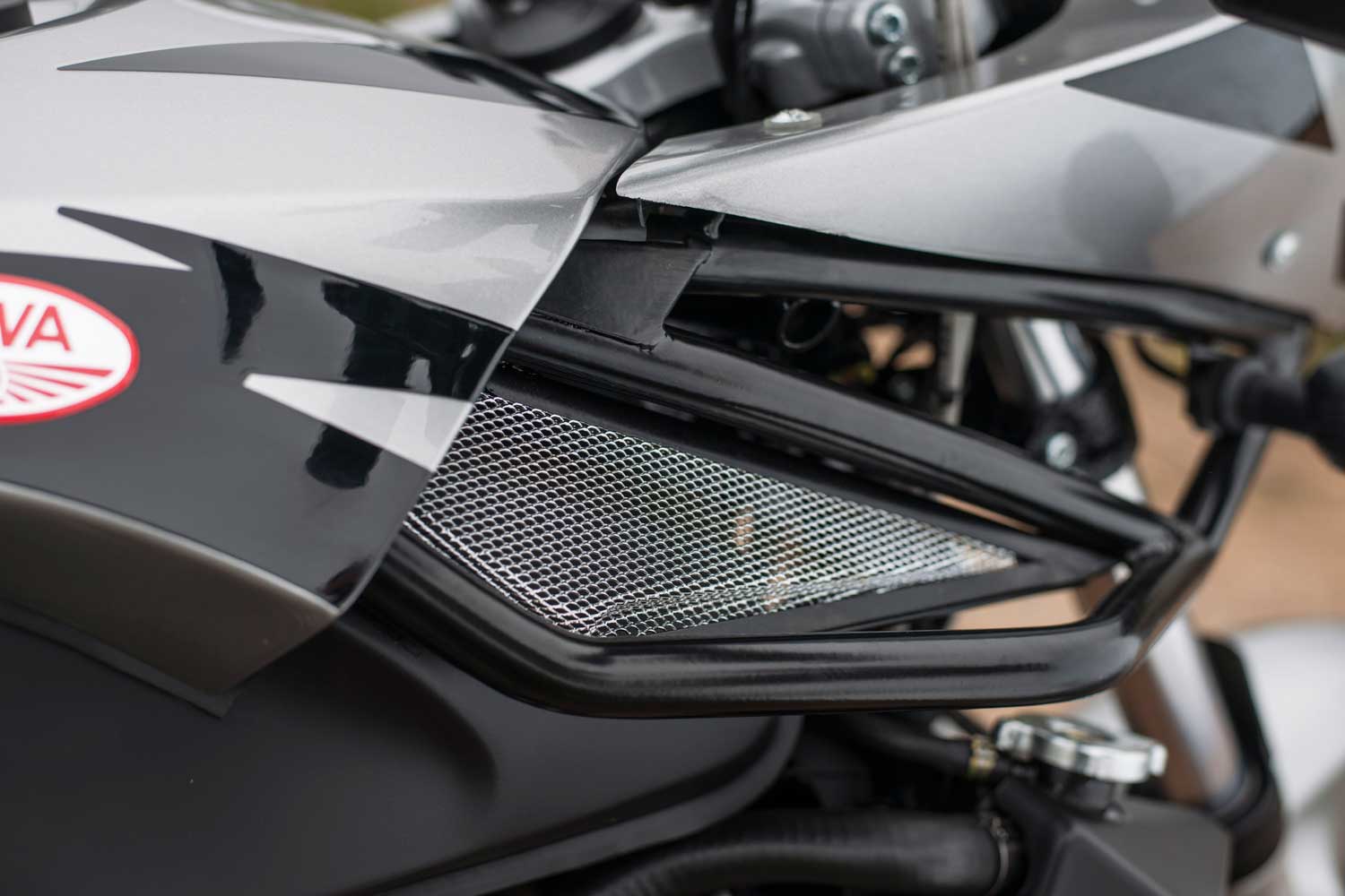 A tubular steel frame, it’s solidly built with a quality aluminium swingarm. A subframe supporting the headlights, bikini fairing and clocks is cleverly designed to offer crash protection to the sides if you’re unlucky enough to drop the bike.