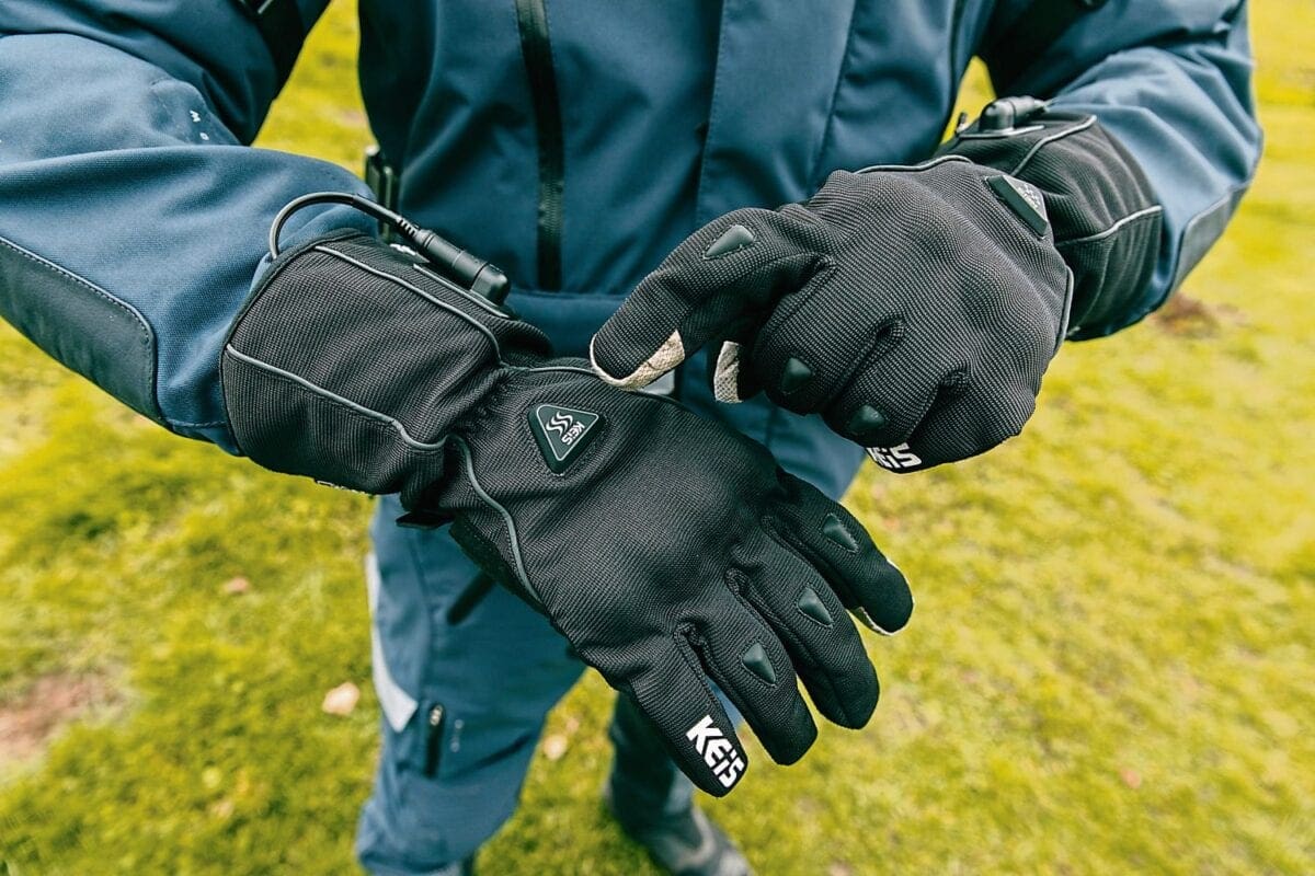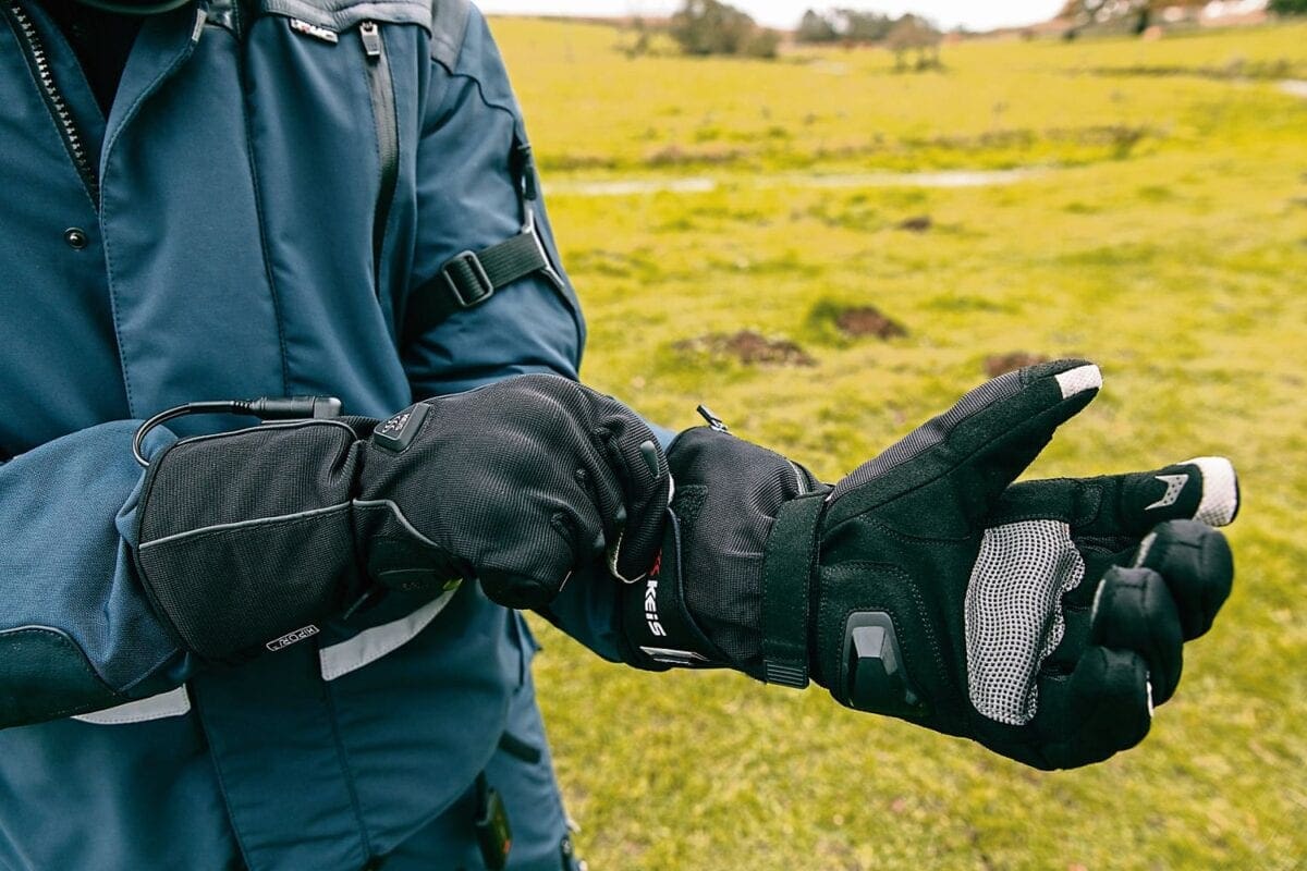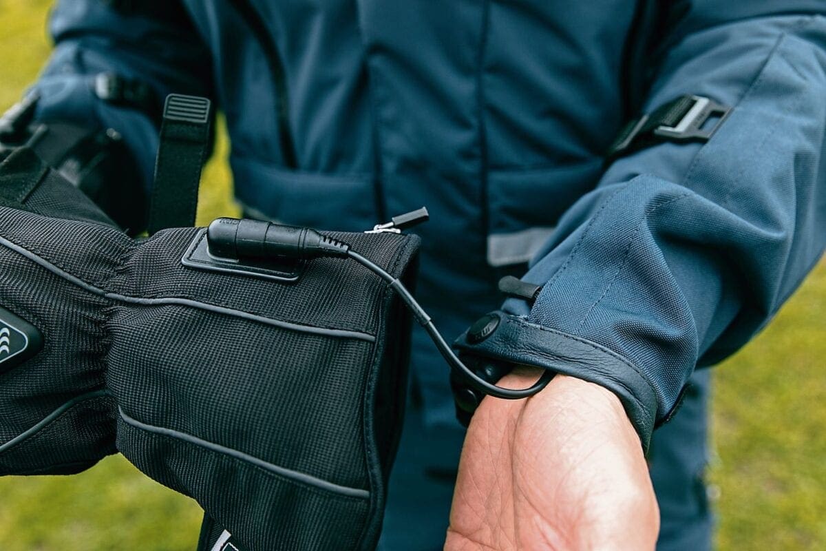 winter gloves from one of the big names, and allow plenty of dexterity and feel for delicate handling of the controls. For powering them you’ve got a couple of options. You can either hook the gloves up to your bike’s battery using the cables provided, or you can lump out a little bit extra and get your hands on a battery for each glove. There are advantages to both choices.