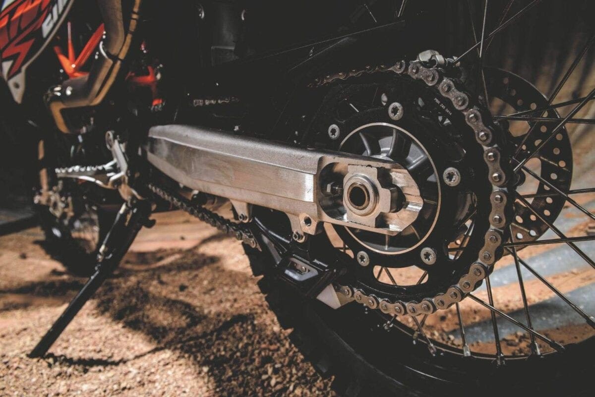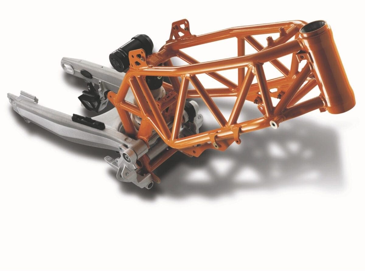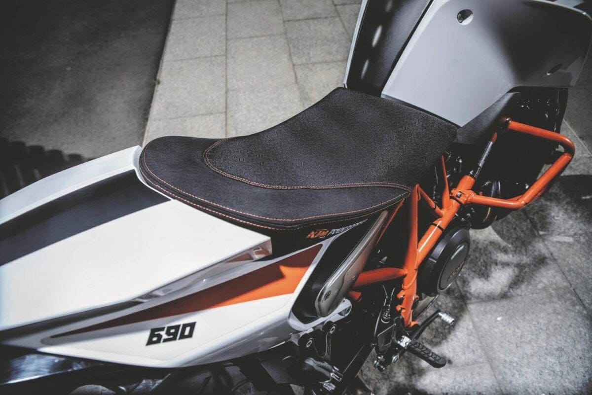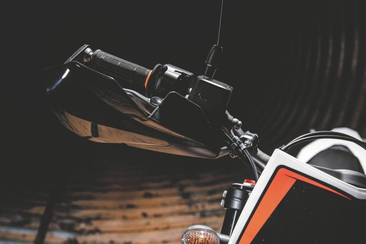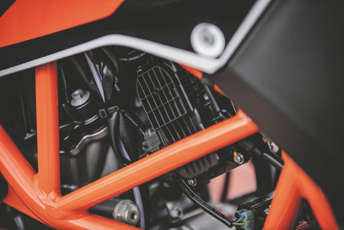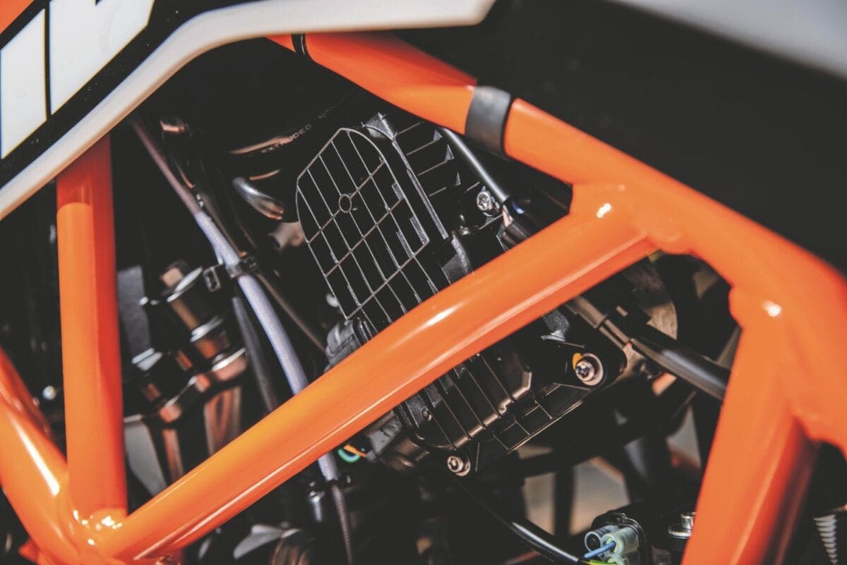 The 690cc, SOHC liquid-cooled engine is borrowed straight from the Duke models, and differs from the old unit mainly with its dual-spark cylinder head and ride-by-wire throttle control. It’s a notably more sophisticated engine, with separate fuel mapping for each spark plug helping to give more efficient combustion. KTM say it produces reduced emissions and gives 8-10 per cent better fuel economy.