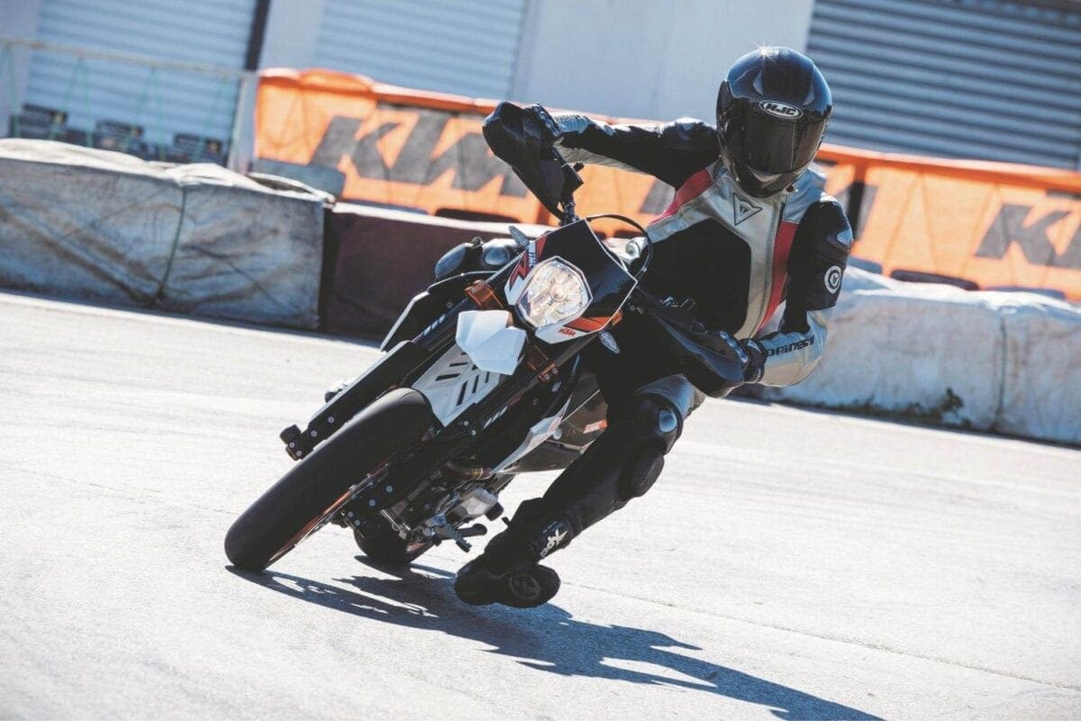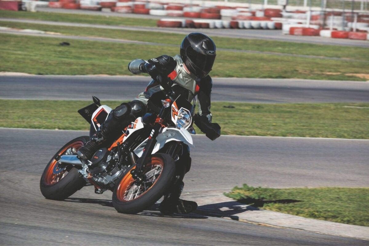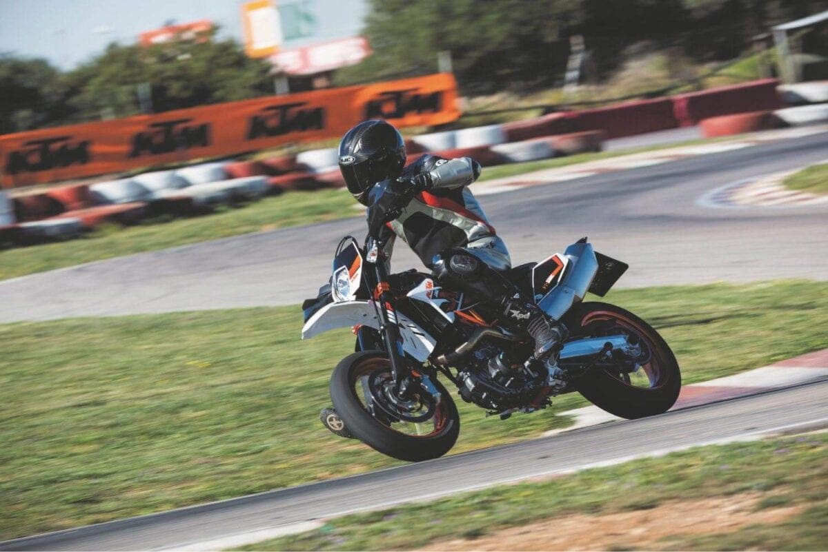 Stopping power was fierce thanks to the lightweight KTM’s big 320mm disc and Brembo radial caliper, with an ABS system that worked well even on the track. For normal riding the system incorporates an anti-stoppie function but the launch bikes were fitted with KTM’s under-seat dongle that disables the rear ABS, allowing skids of the ContiAttack SM radial into turns. Well it does in theory, though in half an hour I didn’t master either that technique or the way supermoto riders stick out their inside leg in bends…