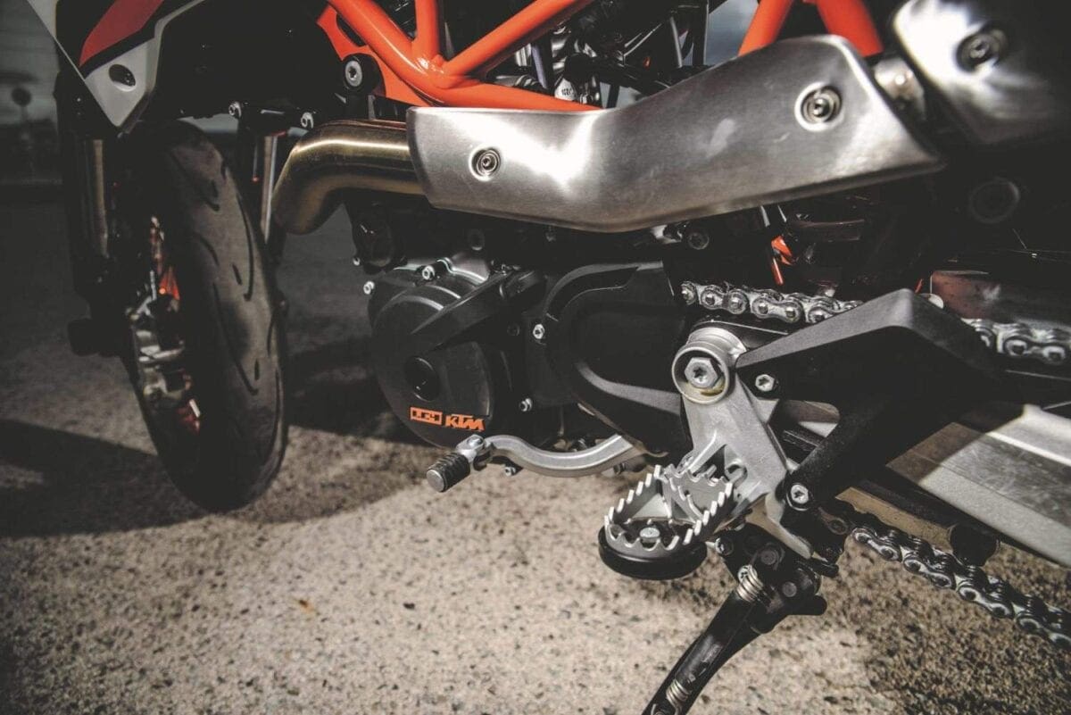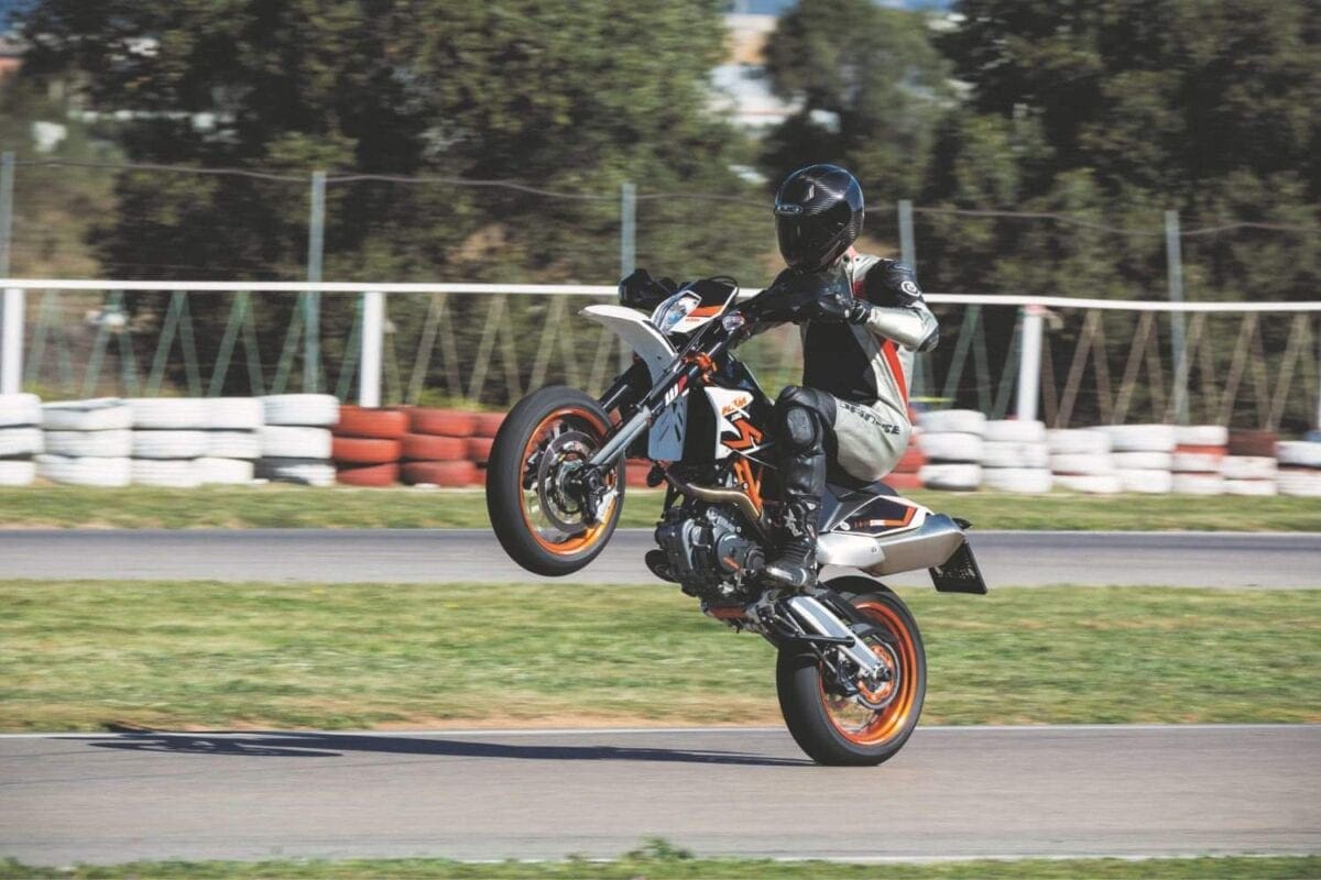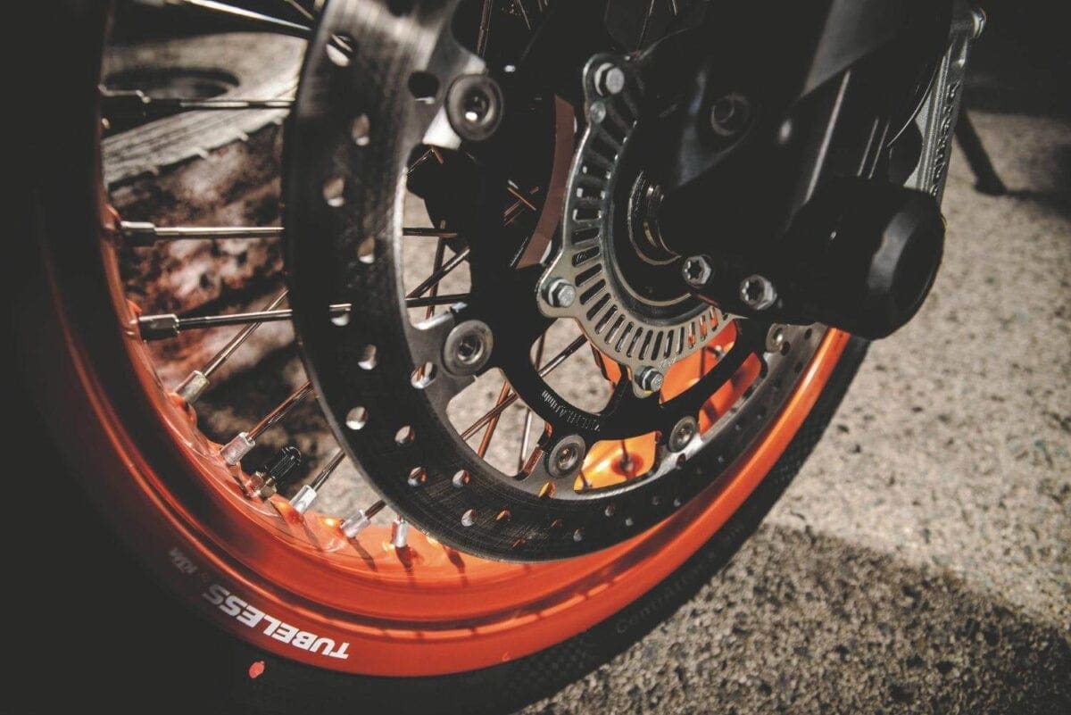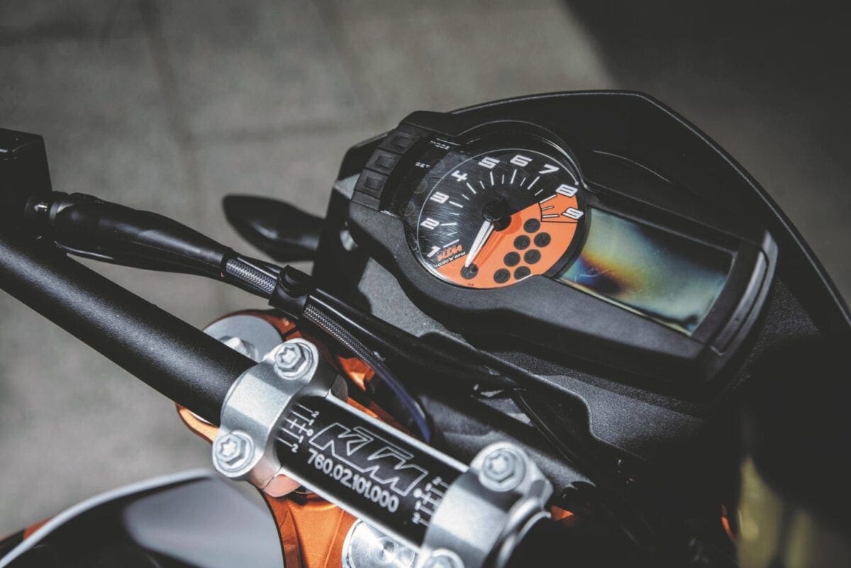 Stopping power was fierce thanks to the lightweight KTM’s big 320mm disc and Brembo radial caliper, with an ABS system that worked well even on the track. For normal riding the system incorporates an anti-stoppie function but the launch bikes were fitted with KTM’s under-seat dongle that disables the rear ABS, allowing skids of the ContiAttack SM radial into turns. Well it does in theory, though in half an hour I didn’t master either that technique or the way supermoto riders stick out their inside leg in bends…