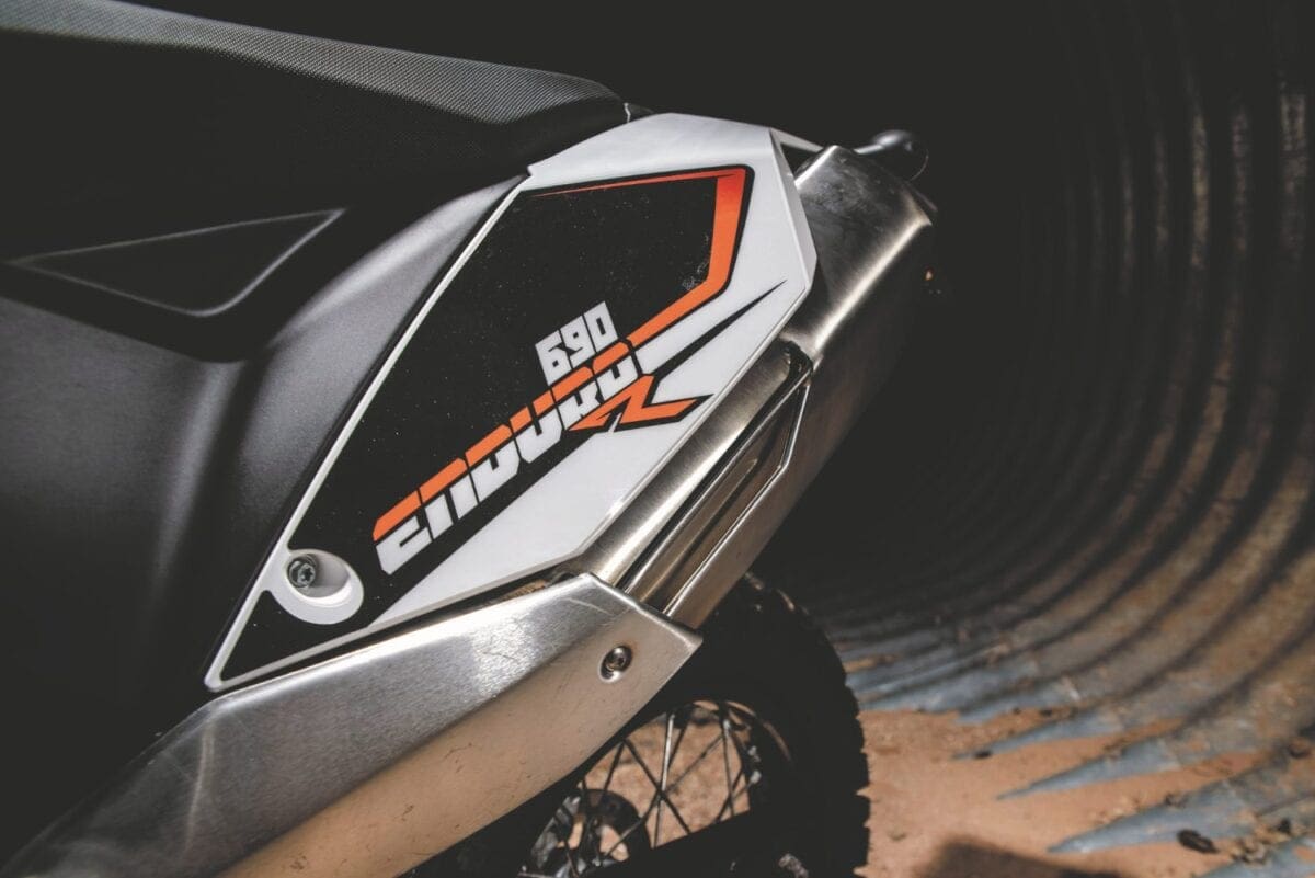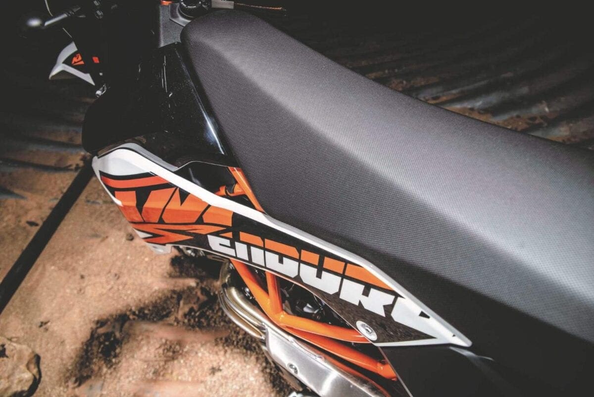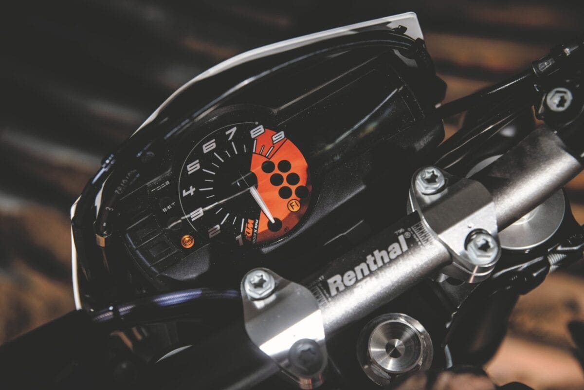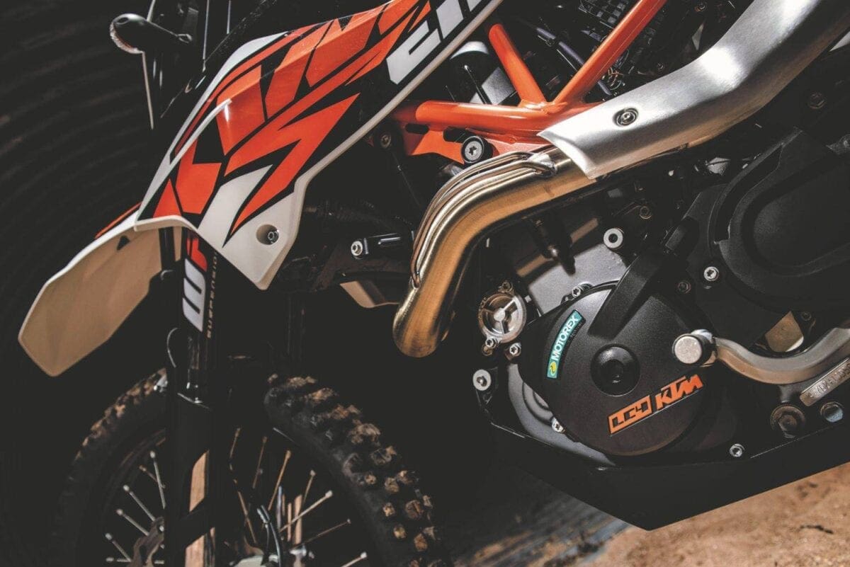In their different ways the KTMs are both classy looking bikes, their many neat touches including the orange-finished chrome molybdenum steel frame tubes. Both feel pretty serious when you climb aboard a long, thin and not very comfortable single seat that’s a dizzying height off the ground — the Enduro’s higher by 20mm, at 910mm. At least the long-travel suspension compresses enough to allow average height riders to get a foot down, just about. And at under 145kg they’re light enough to be manageable as soon as you pull away.